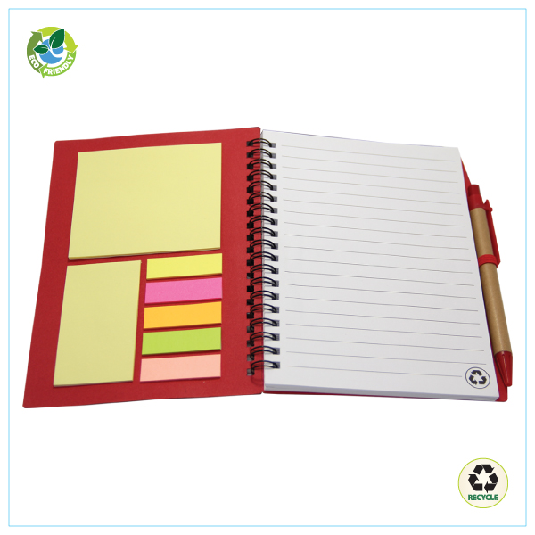 These EcoFriendly Notebooks comes with pages of ruled paper a matching ball pen and a newly introduced sheet with sticky notes. Product Size 180 x 141x 15 mm
