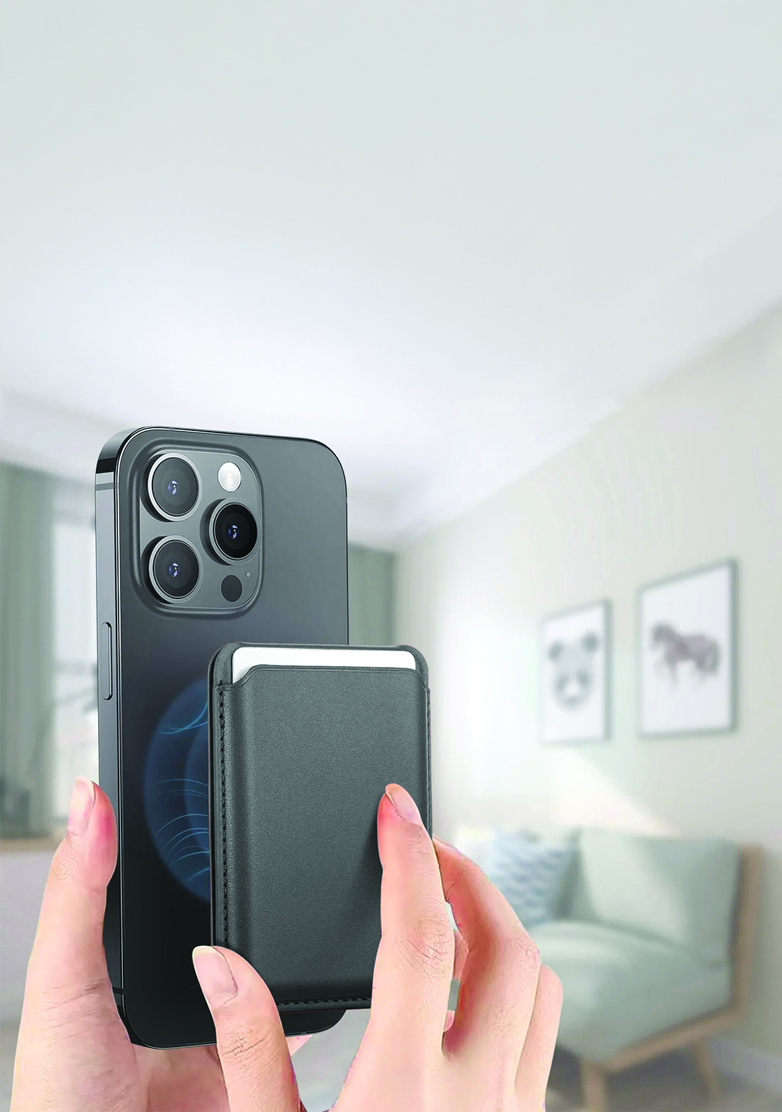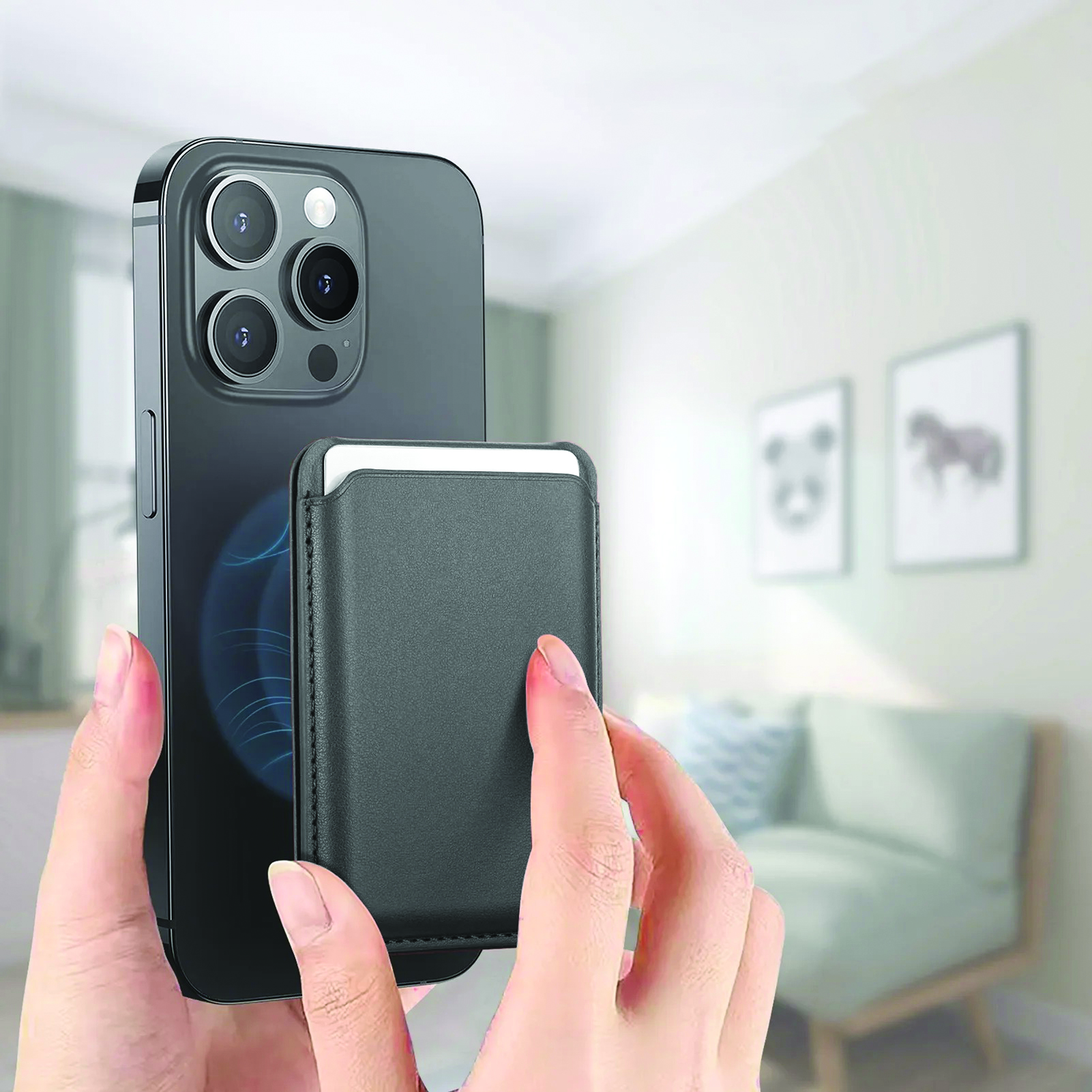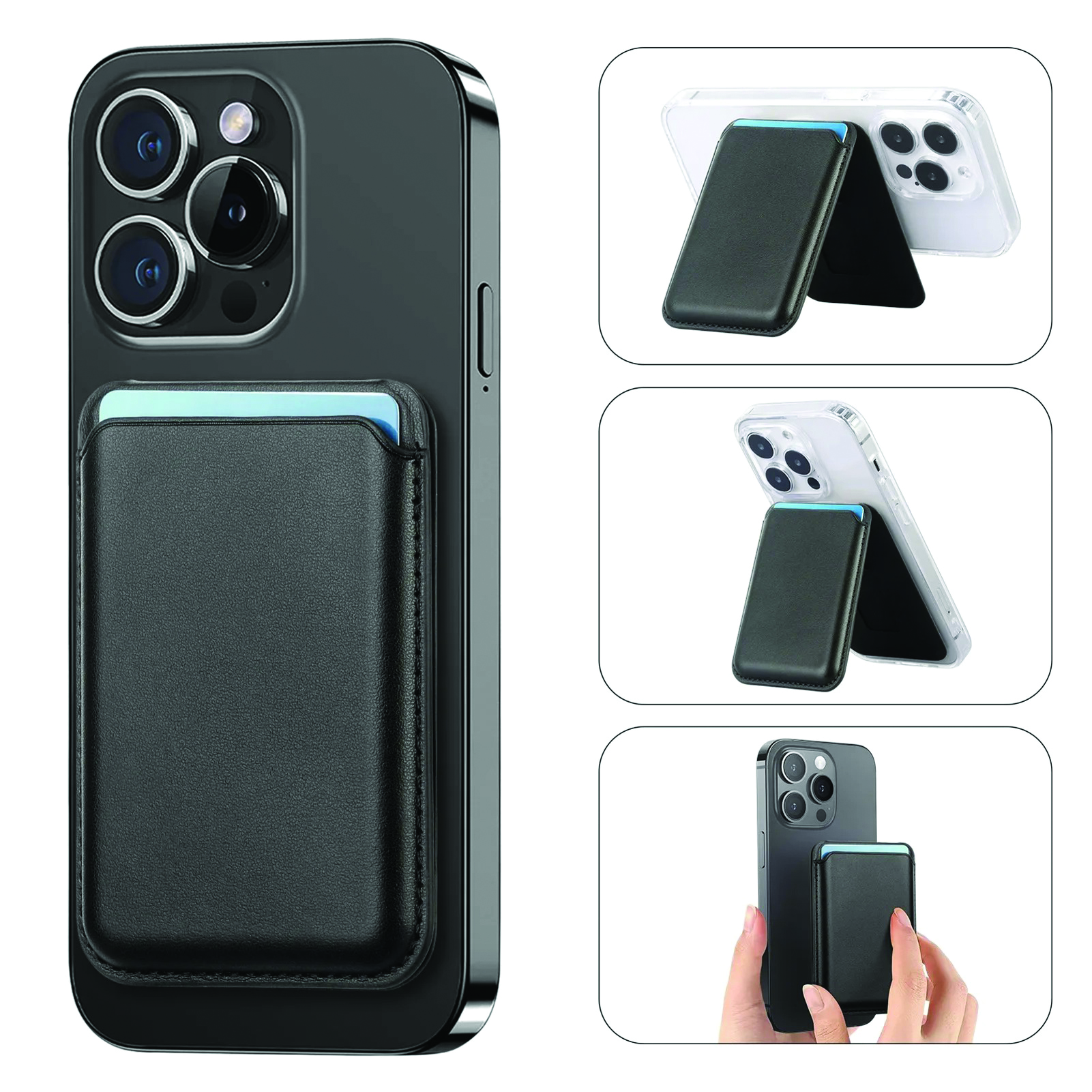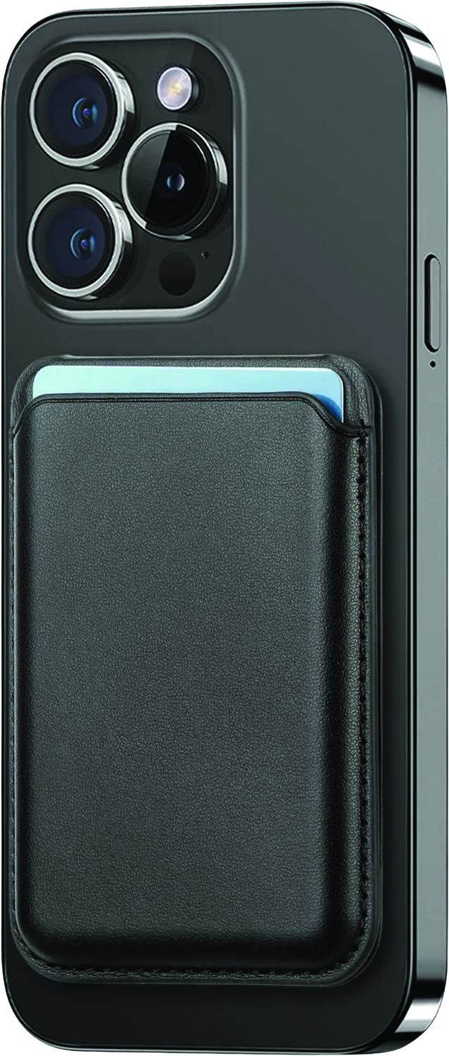 Magnetic, Phone Stand Wallet Secure Credit Card Holder a magnetic phone wallet designed to attach to the back of an iPhone via MagSafe technology. It is designed to hold essential items such as ID or credit cards.