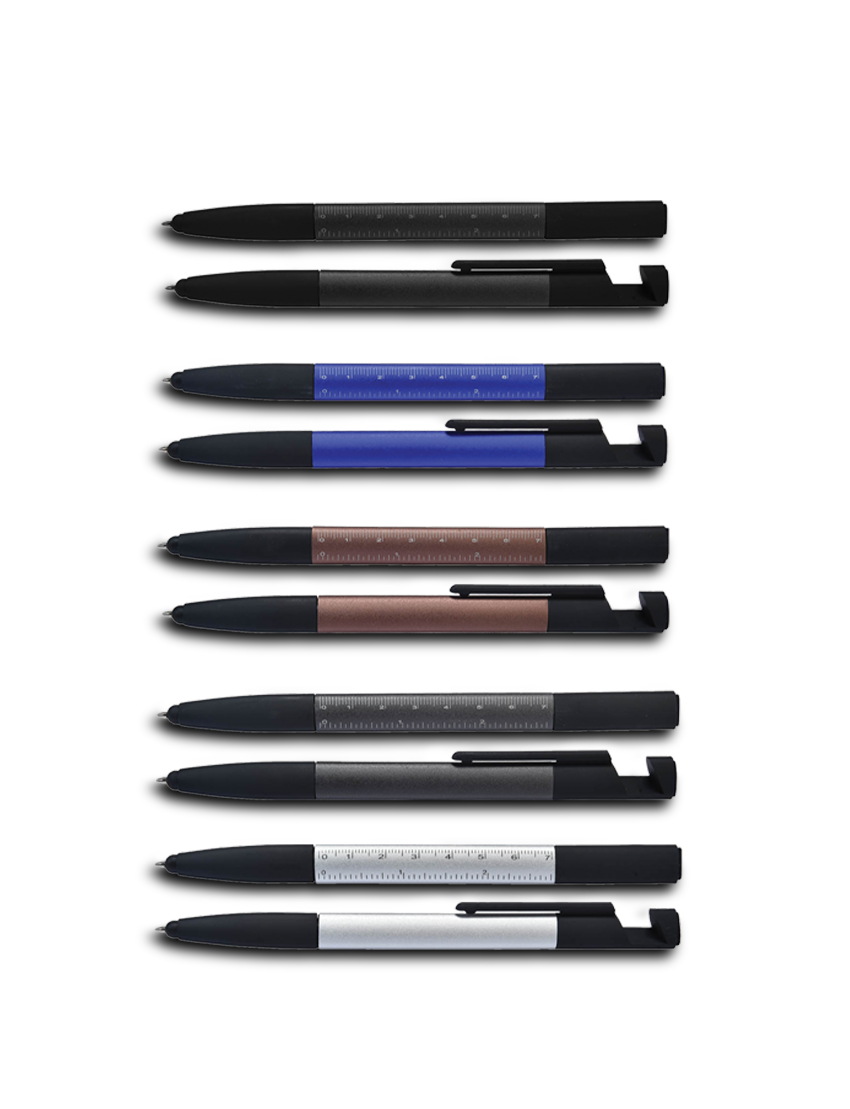 Multifuntional twist ball pen made from aluminum material in which can also be used as Touch Pen Ruler Screen Cleaner Phone Holder and as a Screwdriver. Blue ink. Product Size15.5cm length Packaging Polybag