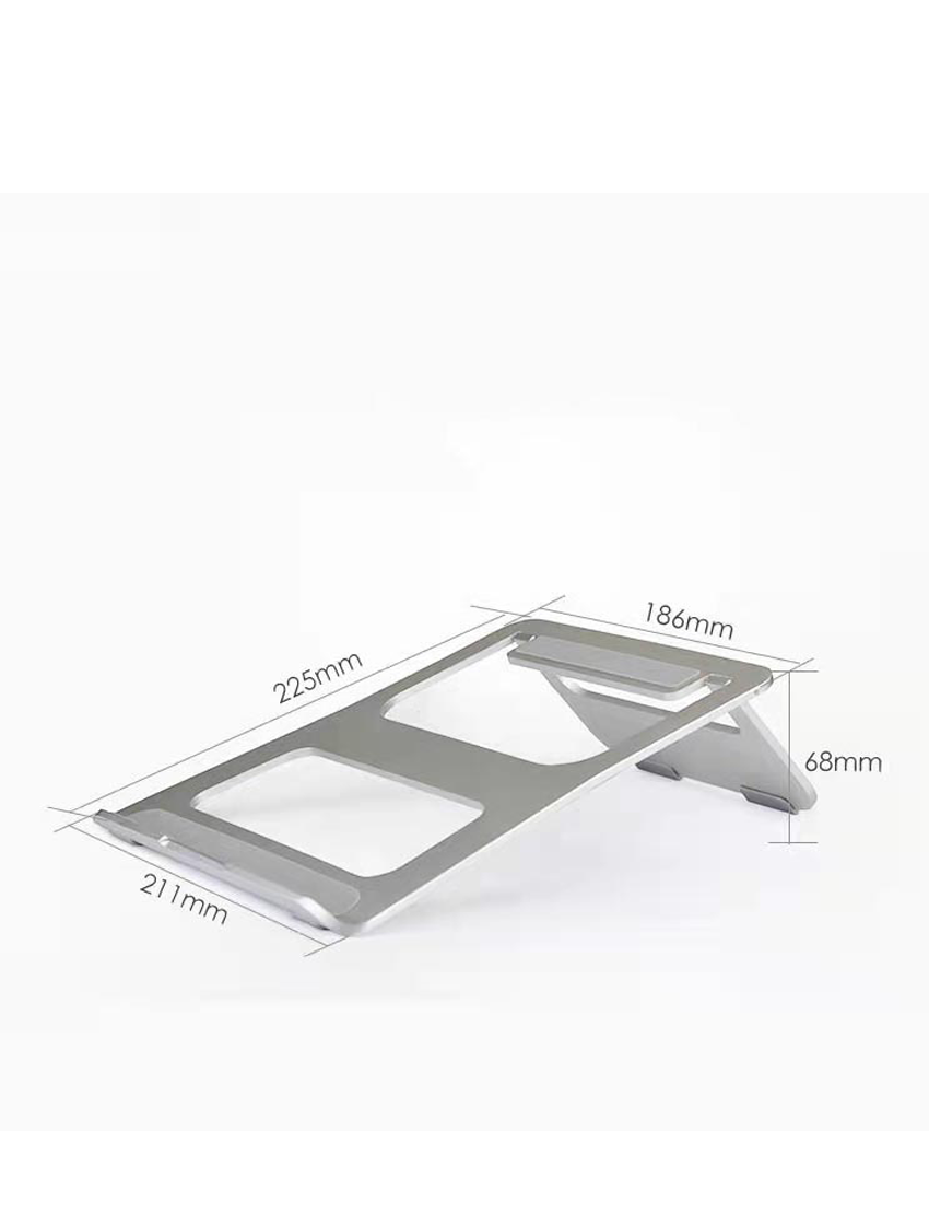 Durable Lightweight and stylish foldable laptop holder in ergonomic comfortable design made of Aluminum has rubber pads to protect your laptop and desk from scratching. Product Size 22.8x22.5x15cm. Packaging Paper box