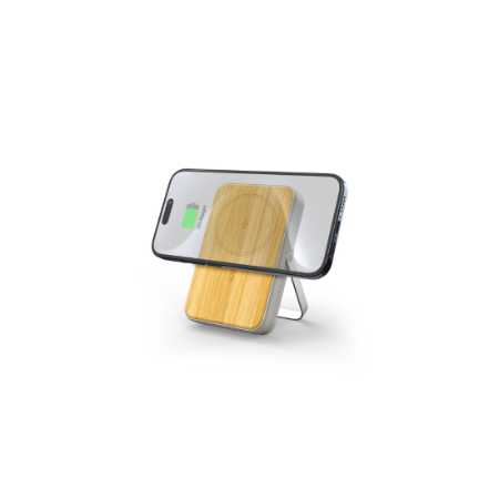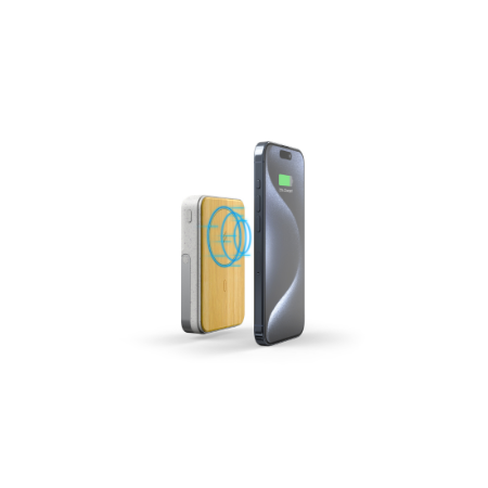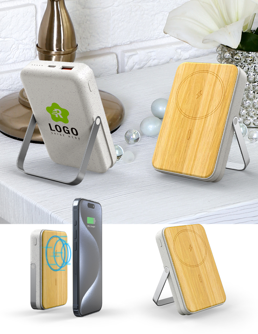 10K mAh magsafe powerbank up to 15W wireless charging in Wheat Material + bamboo material. PD powerbank QC22.5W+PD20W. TypeC input & output. Product Size 6.9x10.5x2.1cm. Packaging Kraft Paper Box