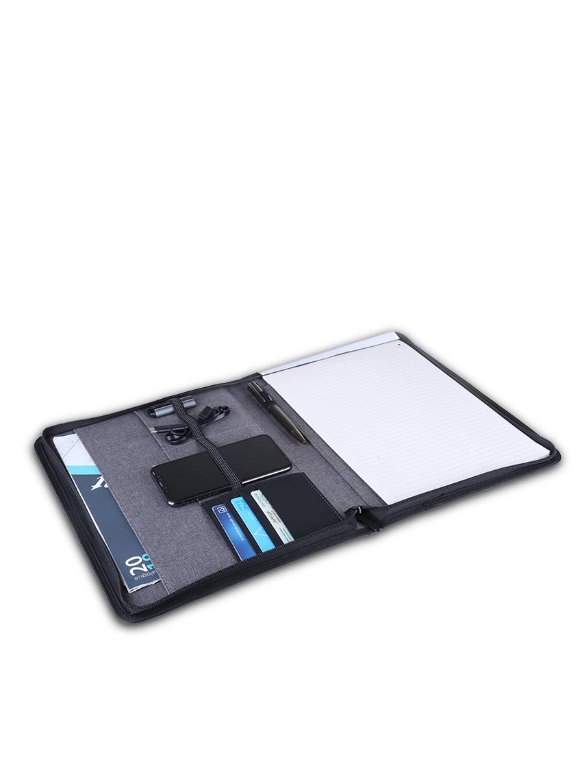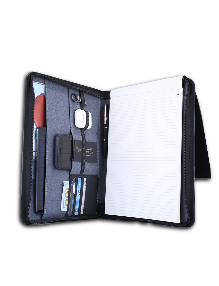 A4 Linen Folder designed with a flap as a pen loop and business card holder. Has pockets inside for mobile documents and cards. An elastic to hold accessories and cables and a pen loop as well. Comes with 25 sheets memo notepad. Product Size32.5x24.8x2.5cm Packaging White Paper Box