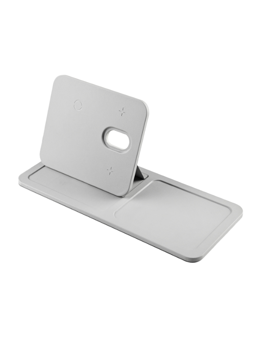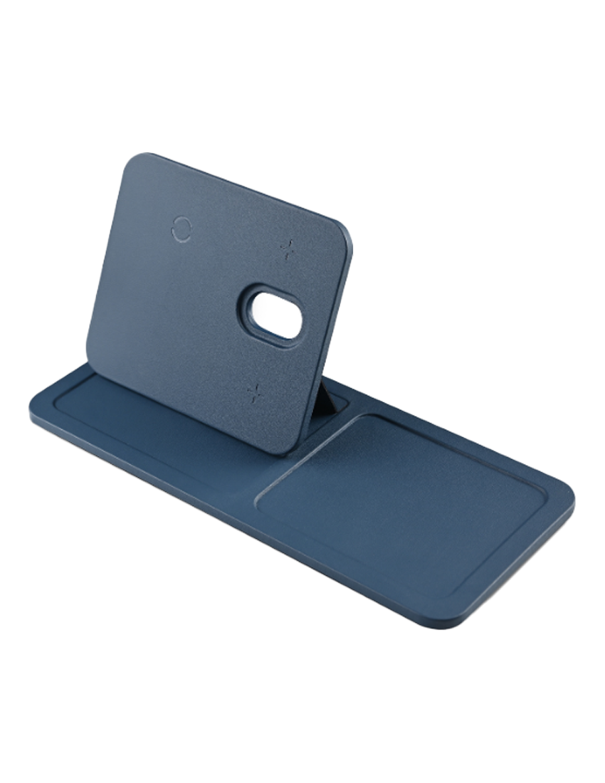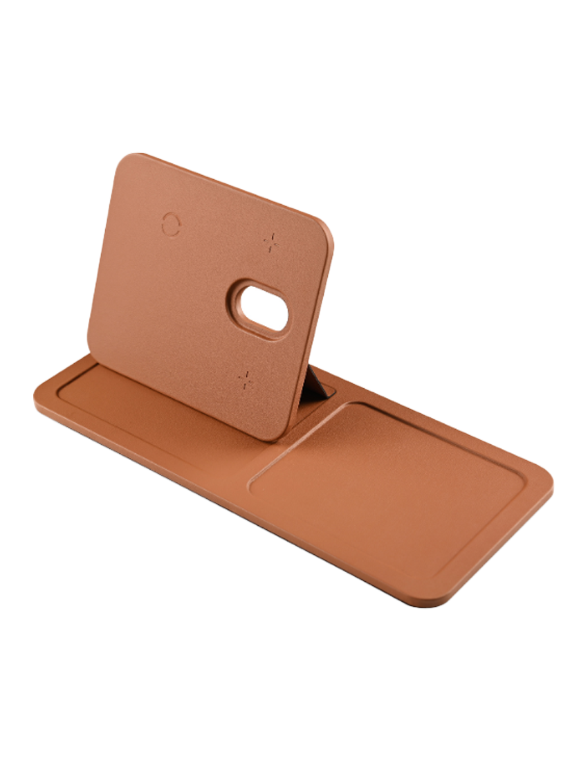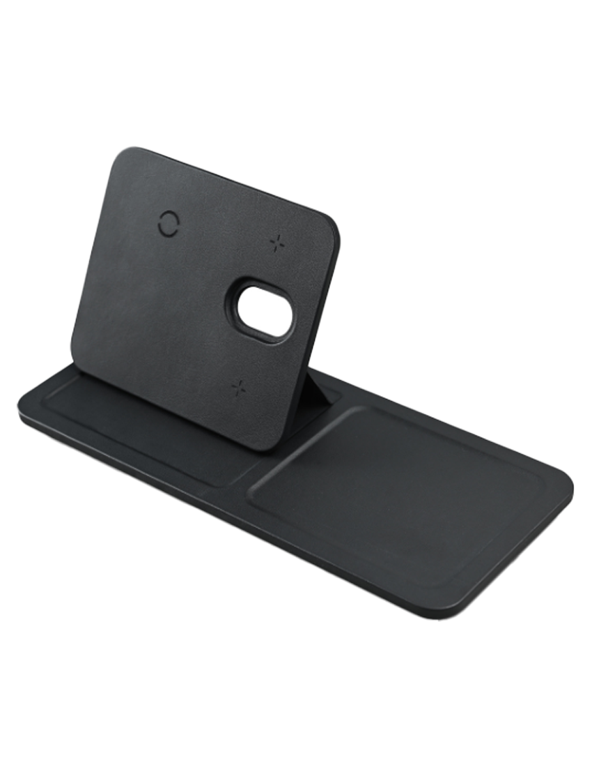 Desktop organizer tray in recycled PU RCS material. Foldable mobile stand 3n1 magsafe charger that can charge mobile airpods and applewatch. Wireless output 5W+5W+2.5W. Product Size 26.8x12.1x1.4cm (closed). Packaging Black Box