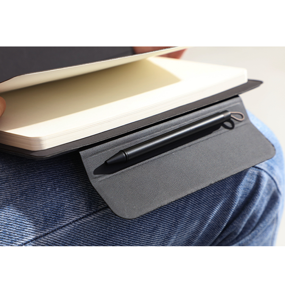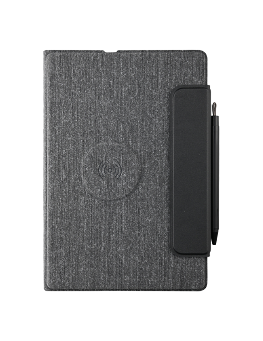 5W magnetic Wireless charger flap 80 sheets notebook in recycled PURCS material. Has a magnetic pen paired to this notebook. Product Size 22.5x15.8x2.3cm. Packaging Kraft Paper Box