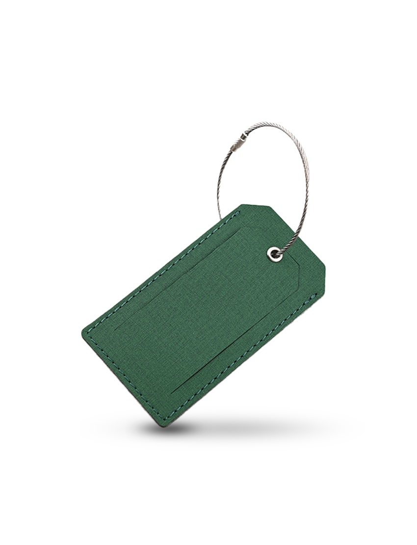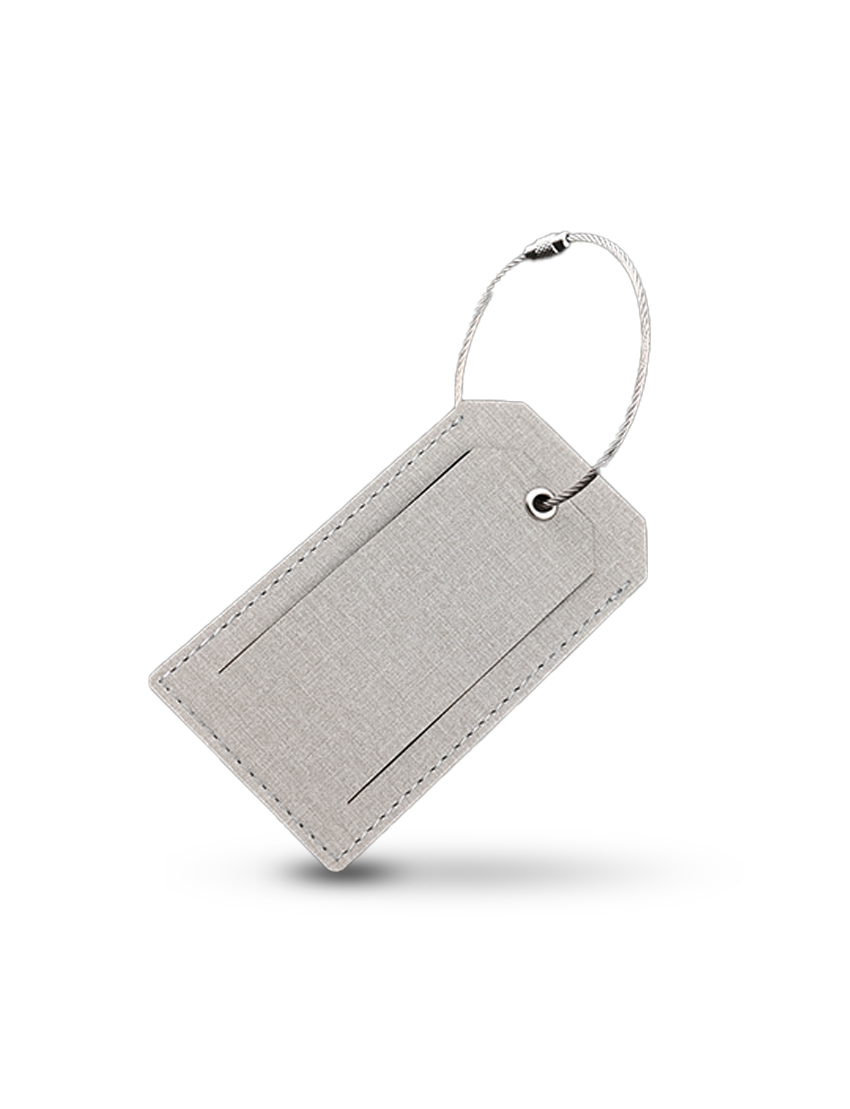 Luggage Tag in RCS PU Material with 2mm thick wire cable loop. Product Size 21.3x14.4x1.5cm. Packaging 6x11cm.Packaging FSC Paper Box