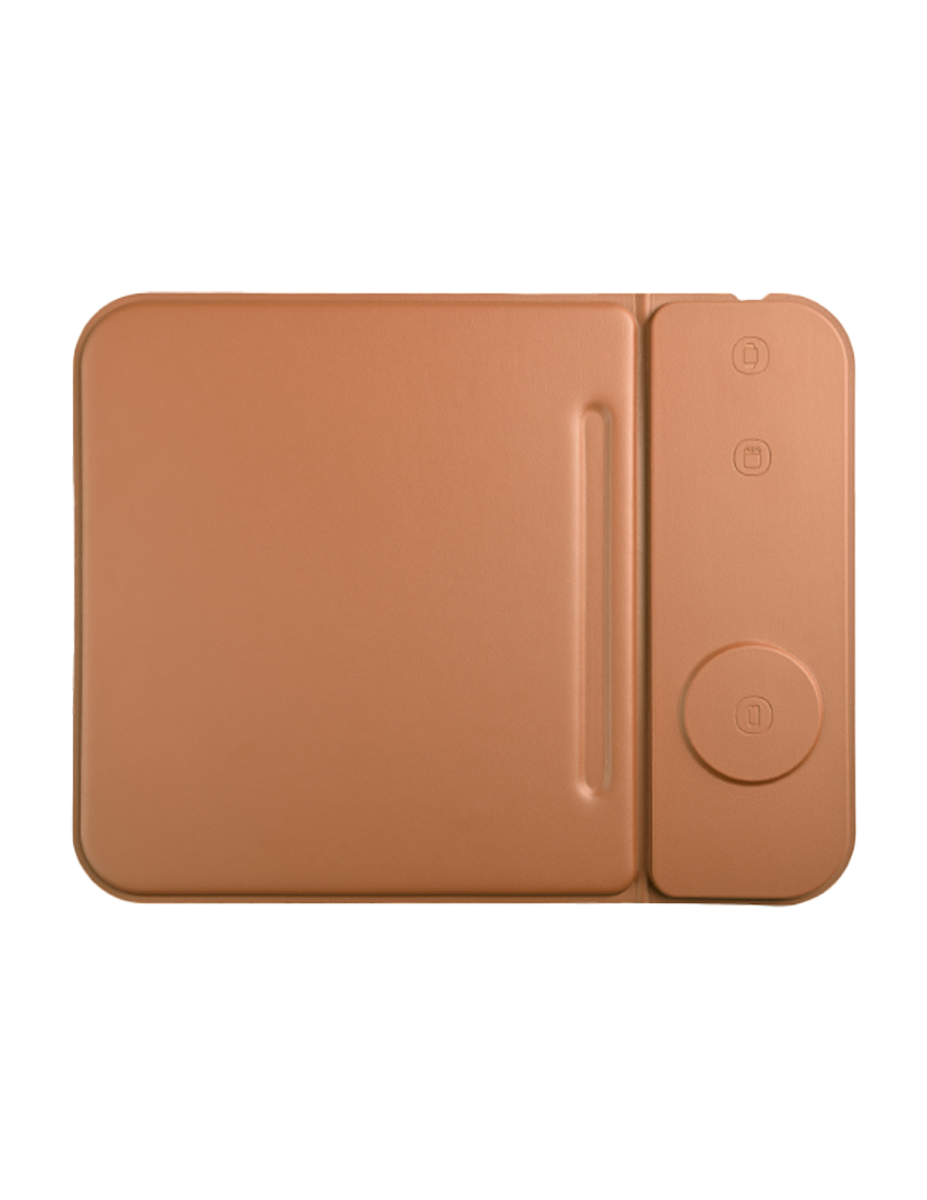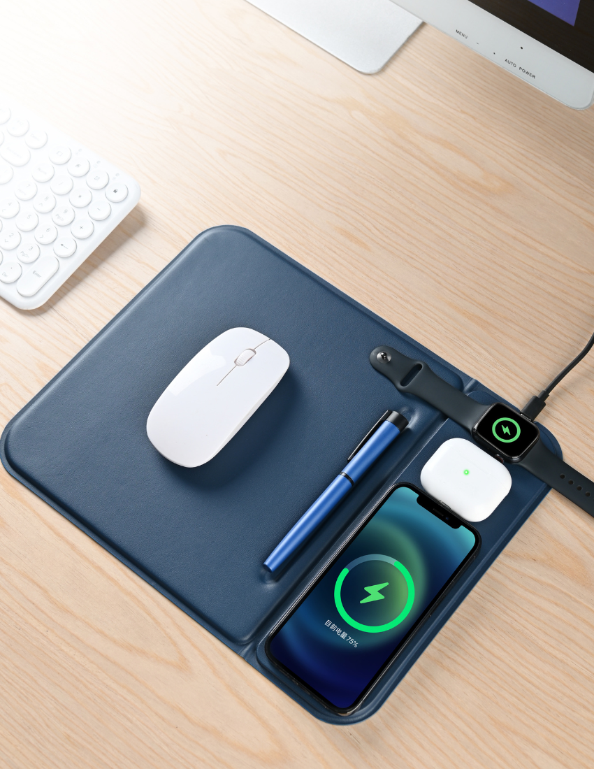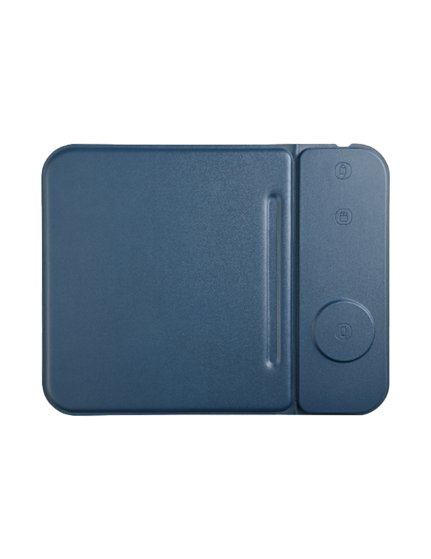 3n1 magsafe mousepad in recycled PURCS material. that can charge mobile airpods and applewatch. Wireless output 5W+5W+2.5W. Product Size 23.3x25x1.25cm (folded). Packaging Black Box