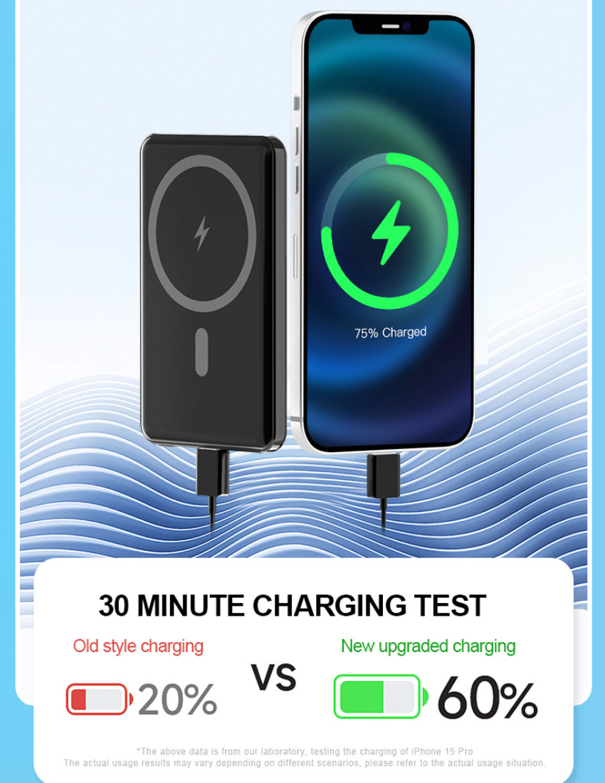 5000 mAh ultra slim metallic magsafe powerbank with smart chip to protect mobile and powerbank from over charging and over heating. Up to 15W wireless charging and 20W PD power charging. TypeC Input 5V/3A; 9V/2A