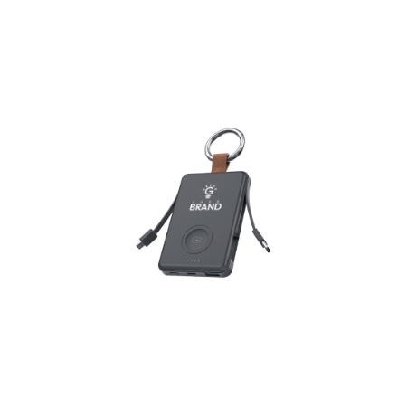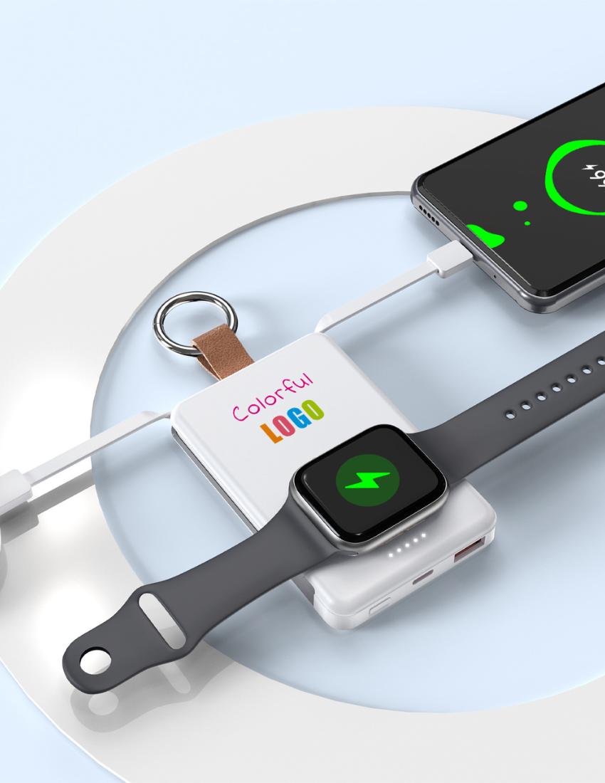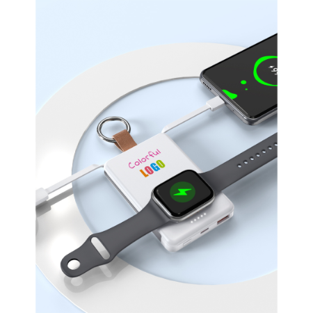 5000Mah Powerbank with builtin cables. Slim powerbank that can charge apple and samsung watches wirelessly. Has ring to hold the powerbank in the finger. Product Size 10x5.56x1.47cm. Packaging Paper Box