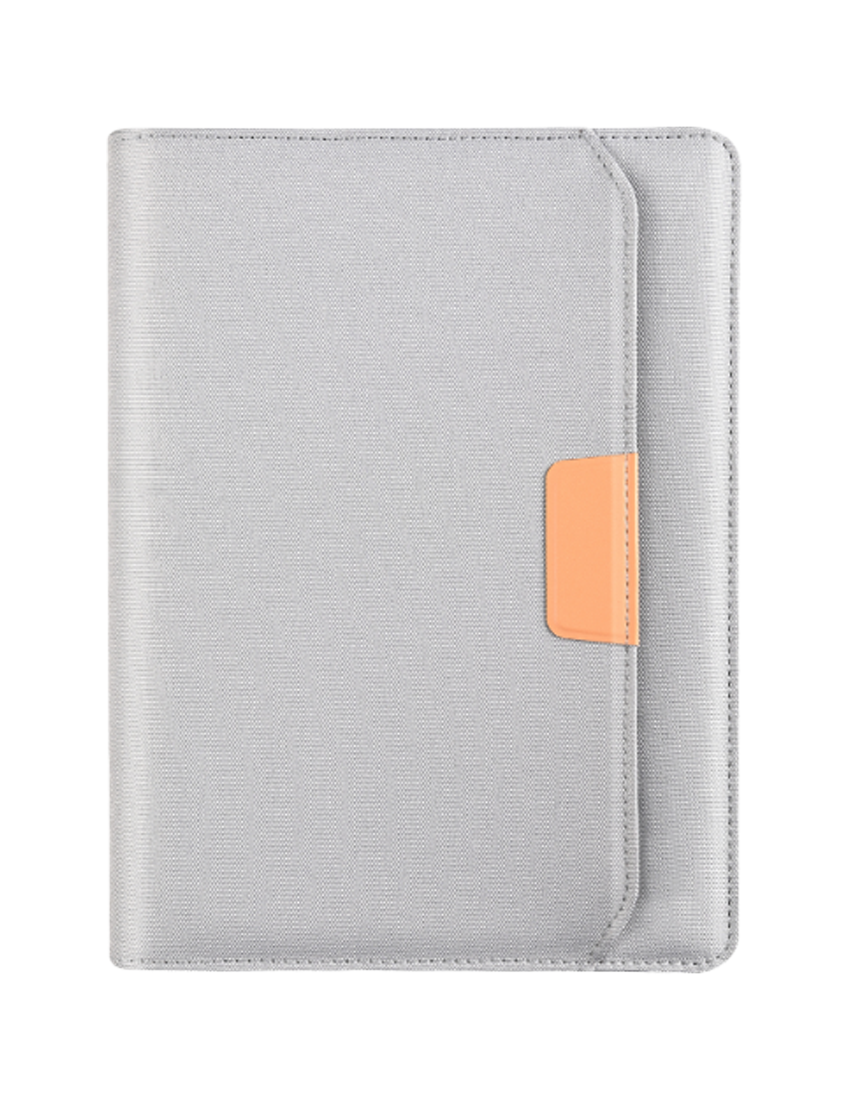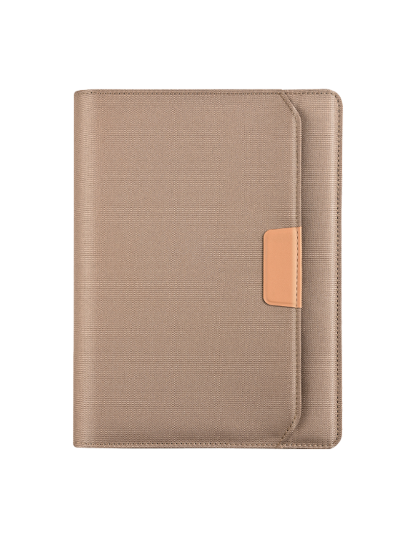 RPET Material B5 portfolio with 100 sheets lined beige sheets in kraft spiral notebook pocket in the cover and inside has document organizer card holder and pen holder with zipper closure. Product Size 26.5x20.8x1.9cm. Packaging Kraft Paper Box