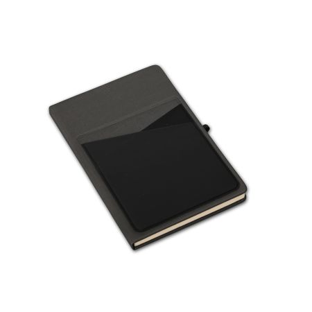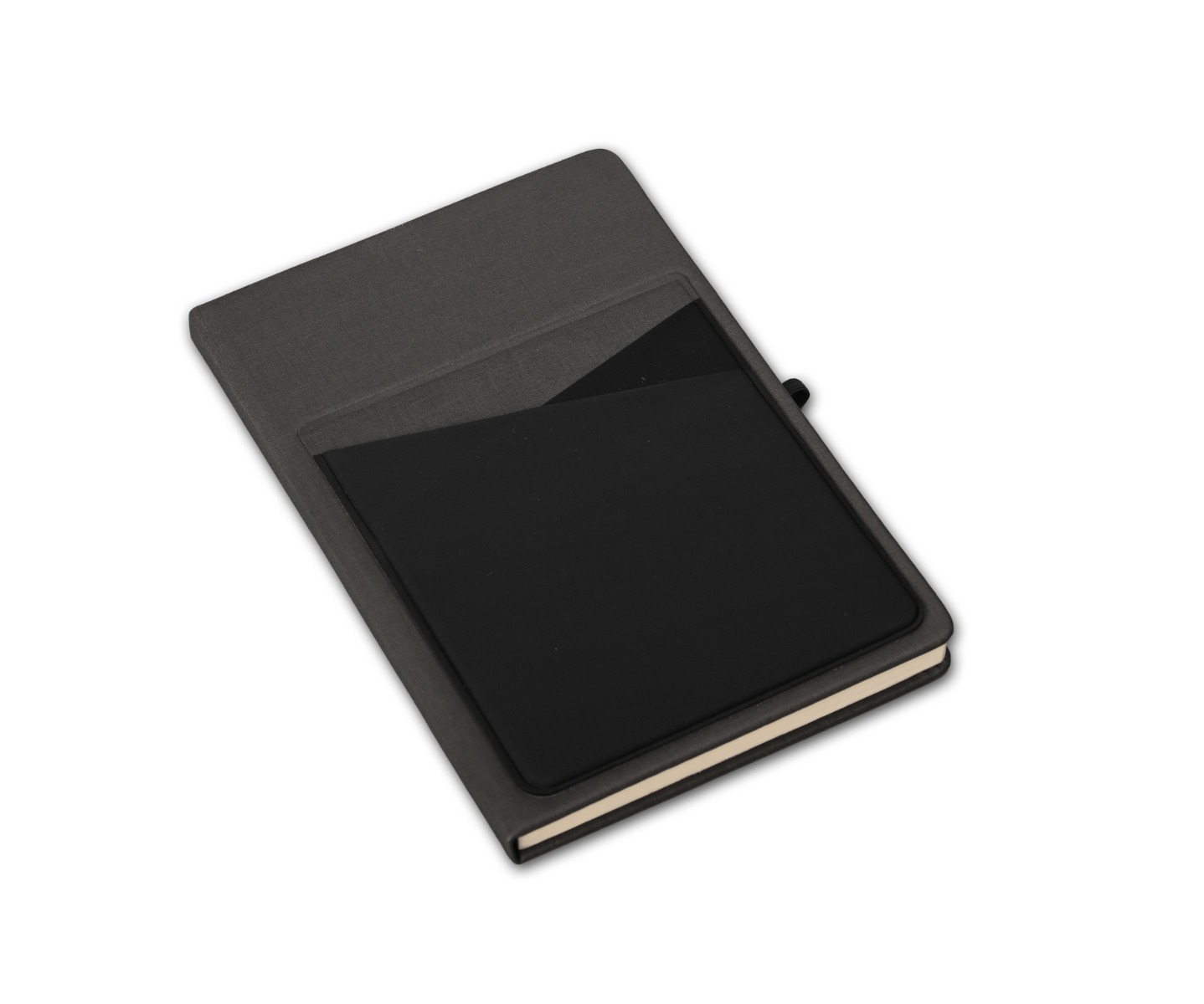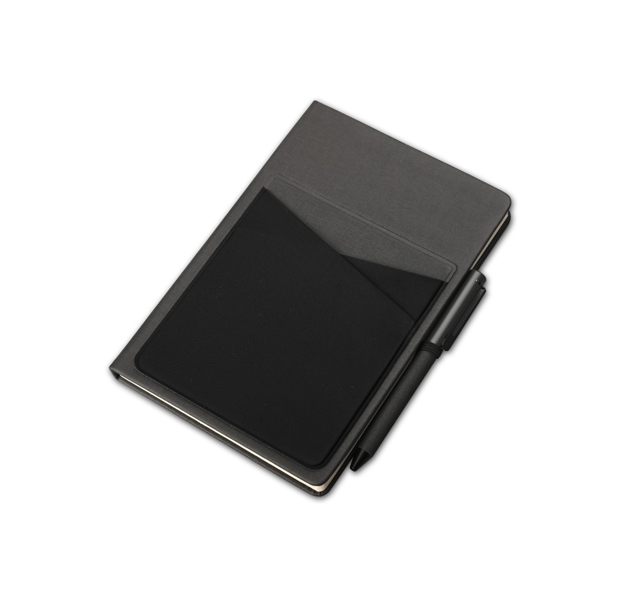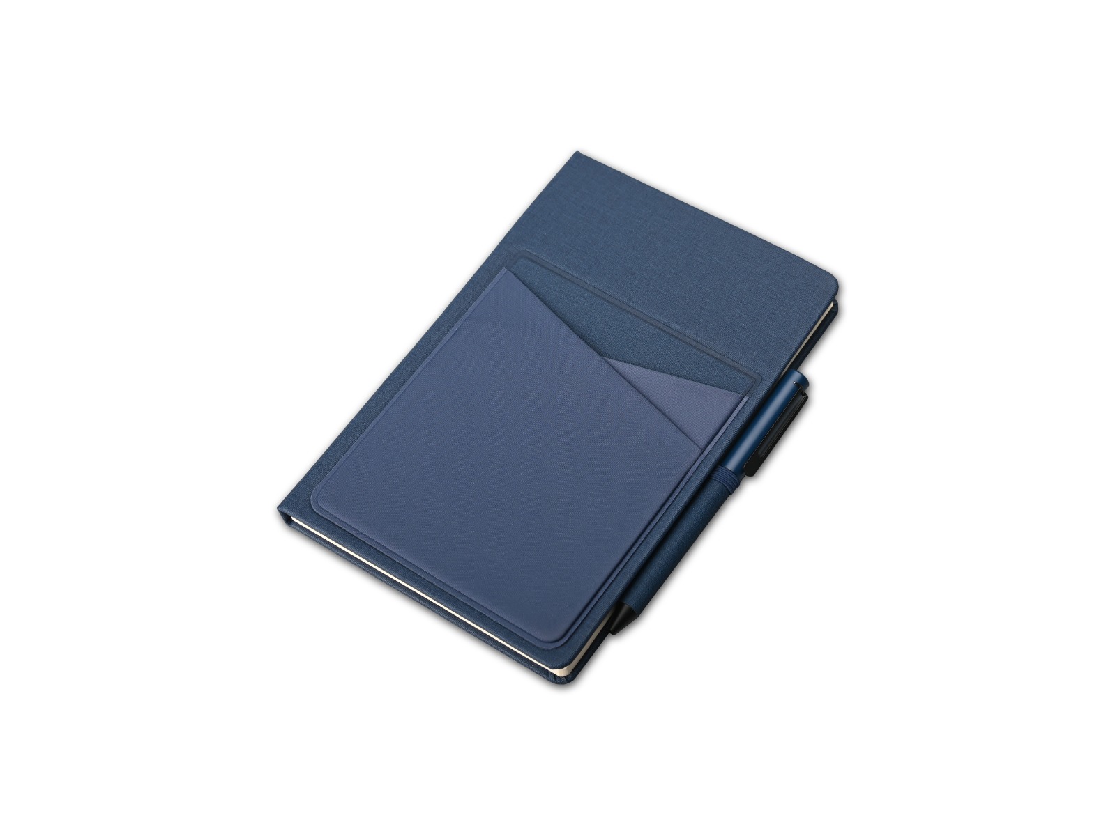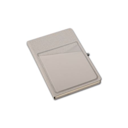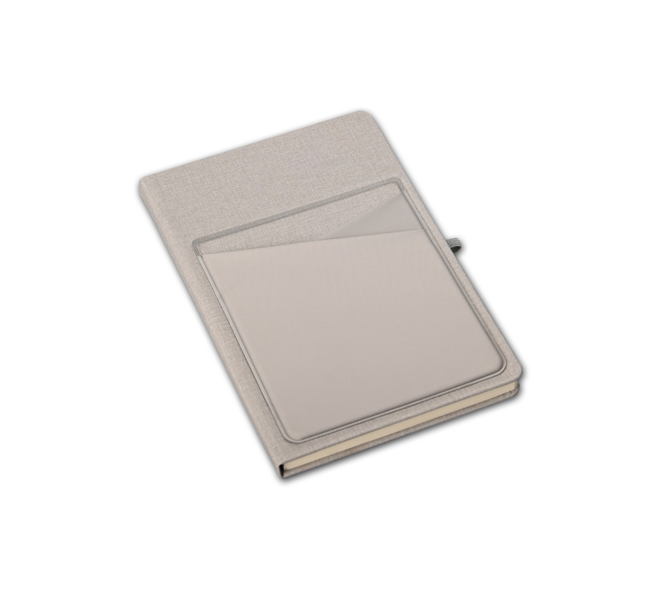 A5 linen 80 sheets notebook with lycra front pockets and pen holder in special PU material. Product size 21.5x14.2x1.5cm. Packaging Polybag