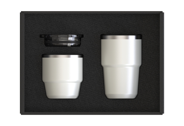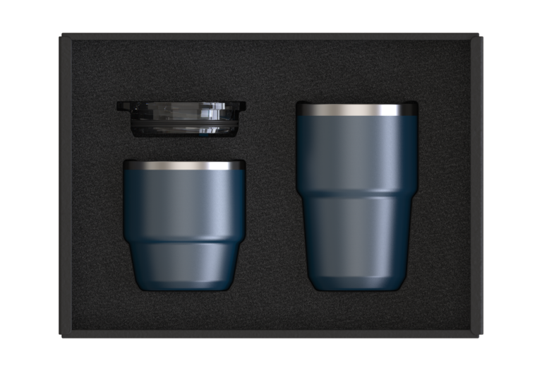 Recycled Stainless Steel Coffee cup Set in 180ml and 240ml capacities perfect in all of your drinking moods. 304 SS inside and 201 SS outside. With one Lid that fits both mugs. Packaging Black Kraft Box