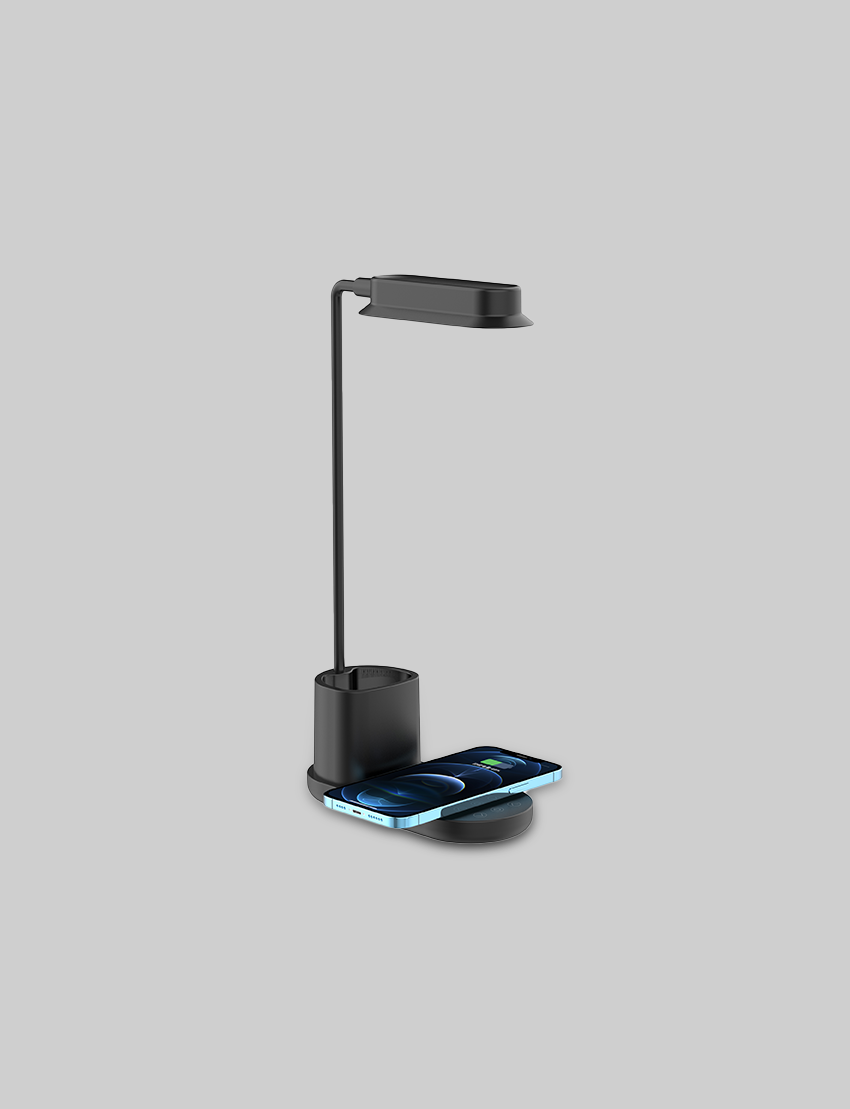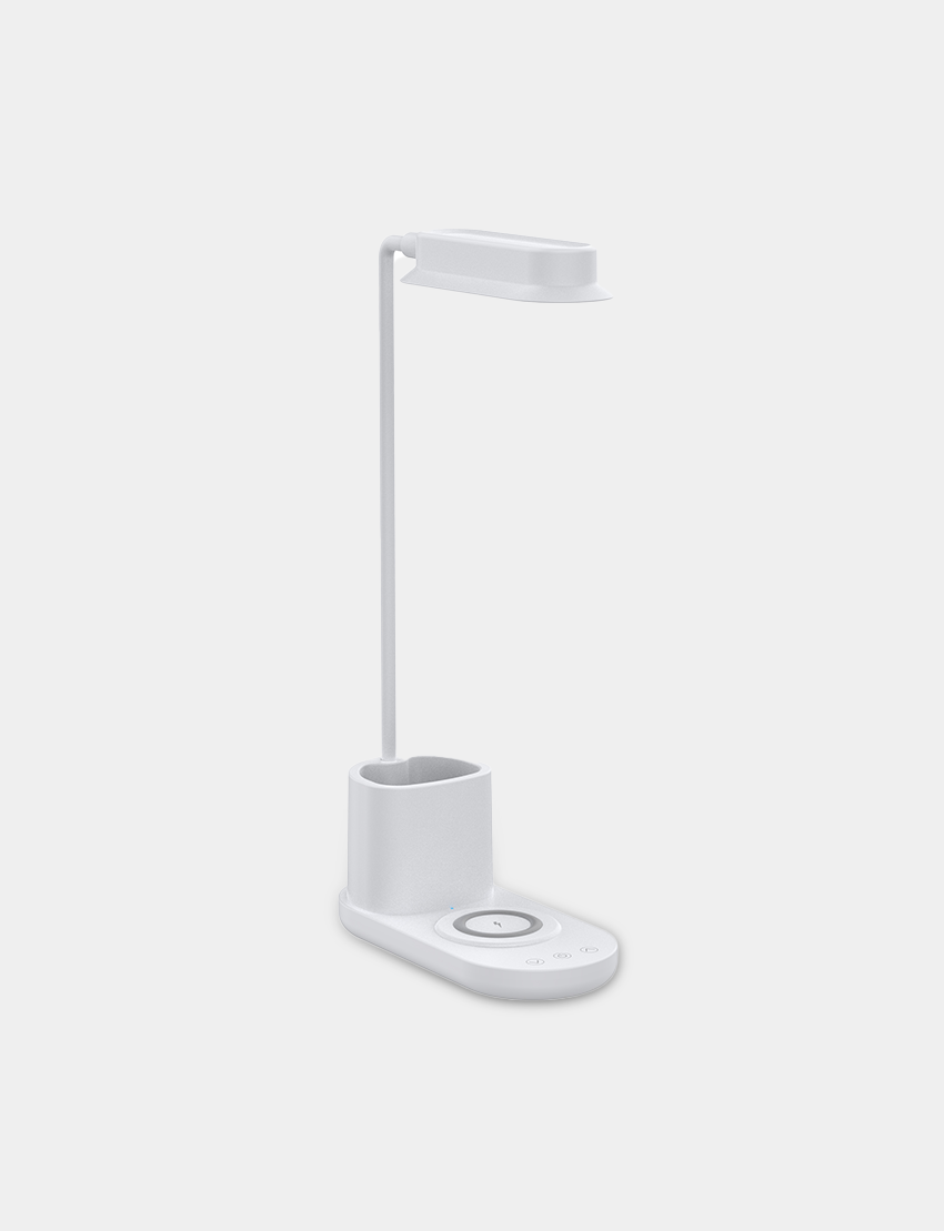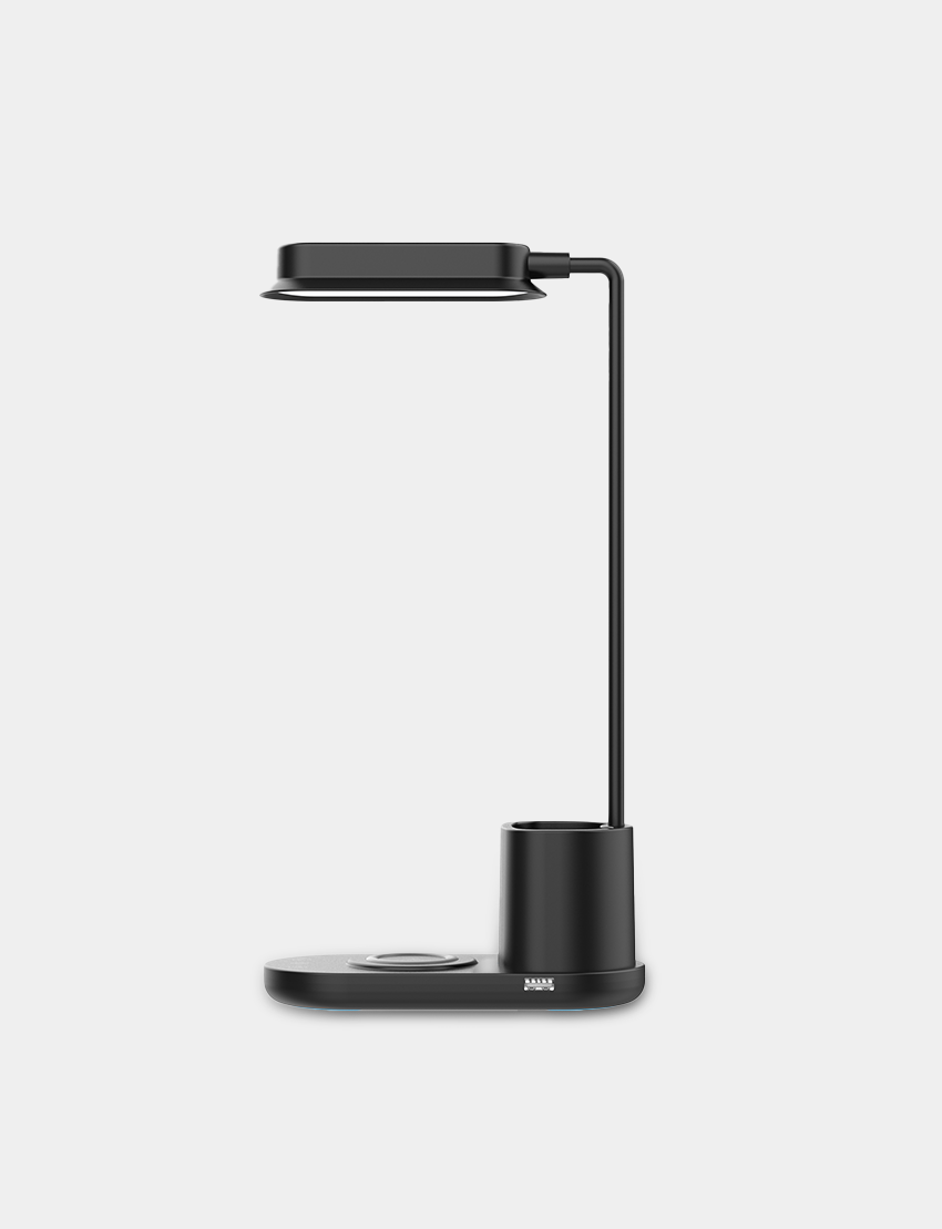 LED Table Lamp with 3 light options and Fast Wireless charging. Input9V1.67A 5V/2A . Wireless charger Output 9V/1.2A 5V/1.5A. Product Size 8.35x18.2x48.5cm. Packaging Paper box