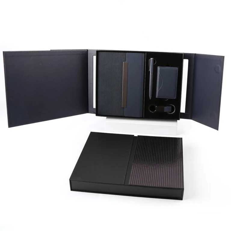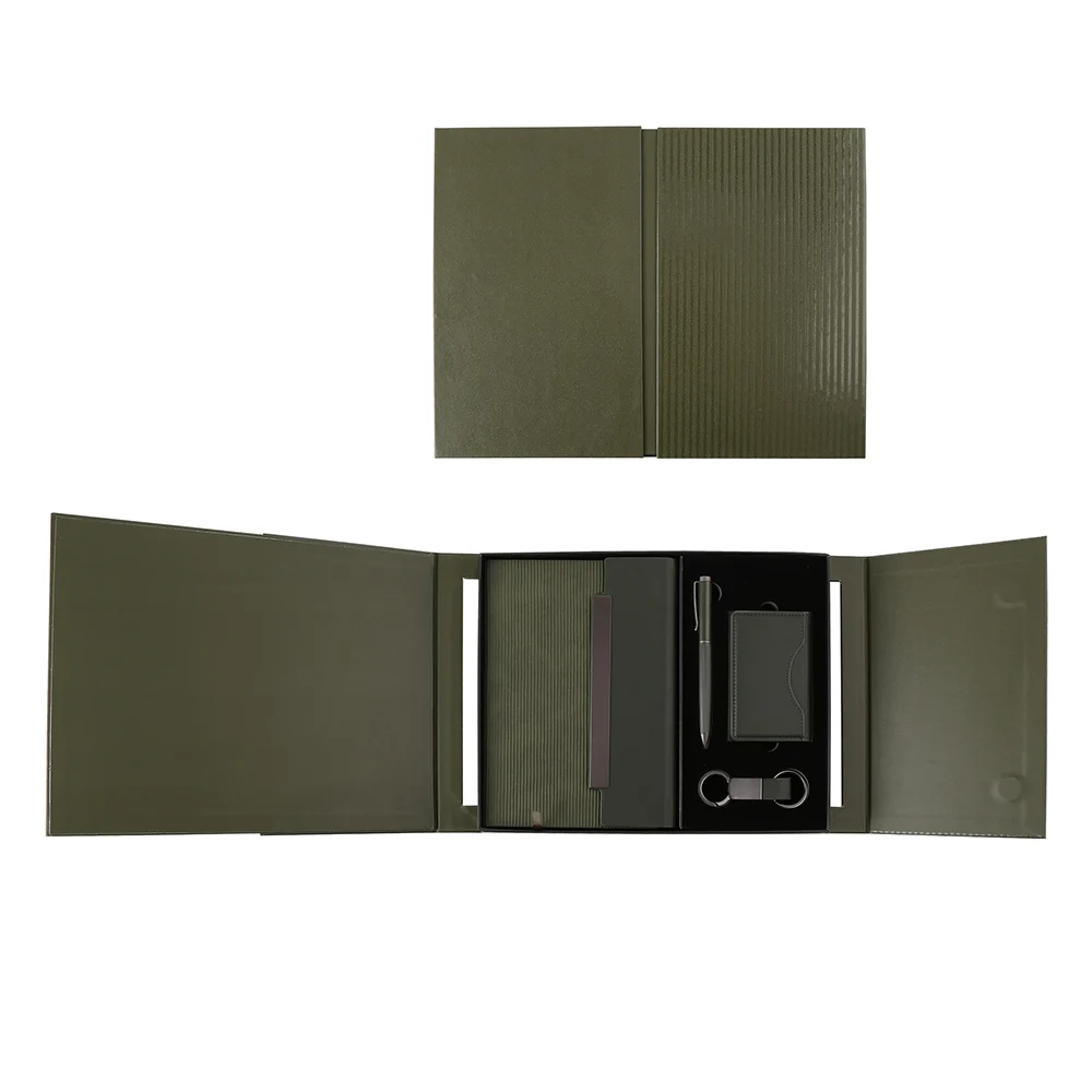 Premium Gift Set for Professionals. A sleek and practical 4-piece business gift set designed for daily use or corporate gifting. Crafted from quality materials for a refined look and feel.Perfect for executives, clients, or professional giveaways. Set includes high quality PU binder notebook, metal pen, PU card holder, PU keychain with metal accessories, packed in an elegant PU box. Product Size: 28.5x22x4cm. Packaging: Paper Sleeve