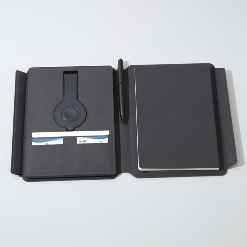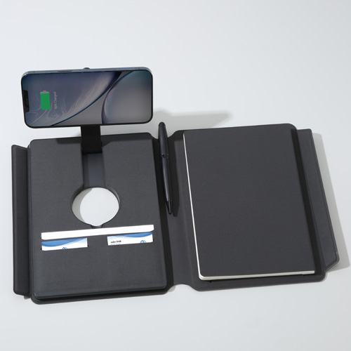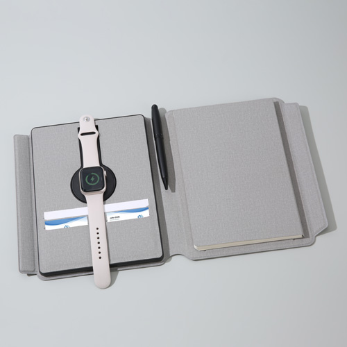 Charge your mobile and watchs, Earpod wirelessly at full speed with this A5 PU material note book with 3 in 1 magsafe 10000 mAh power bank in magnetic flap closure in recycled PU material unique design note book with adjustable magsafe charging function product size: 17.5×22.4×2.2cm, Printing option: Engraving, Screen printing.