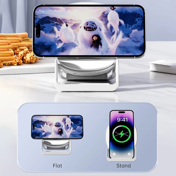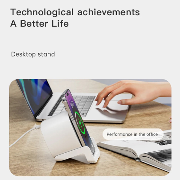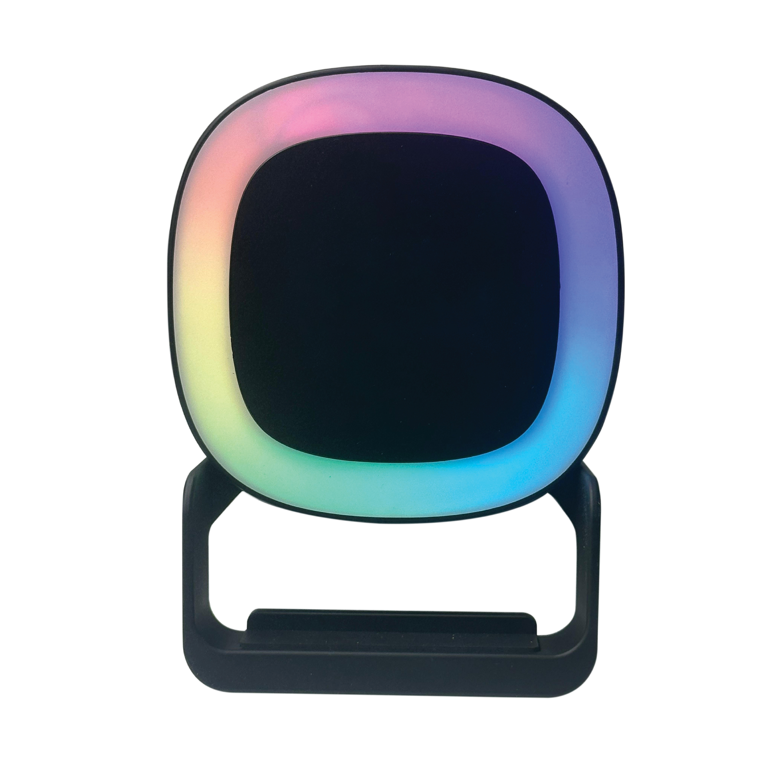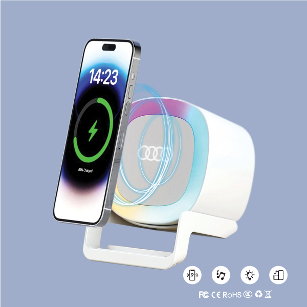 The 5-in-1 Night Light Speaker comes with a wireless charger and phone holder. It is powered by a 9V/3A (max) supply with a 100cm Type-C cable and features Bluetooth V5.1. The speaker delivers 5W ±10% output with a frequency response of 20–20kHz and a working range of over 10 meters. The LED includes 24 pieces (12 RGB and 12 warm) with a brightness of 44LM ±2 and a color temperature of 2700K–5500K. The wireless charger supports input of 9V/2A (QC3.0 required) with a transfer distance of ≤5mm and an output of 15W. The product measures 106 × 97 × 145 mm and can be customized with UV printing or engraving.