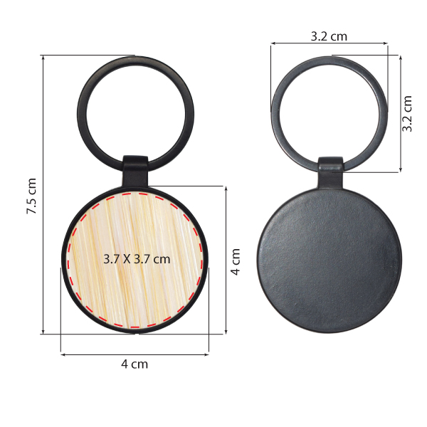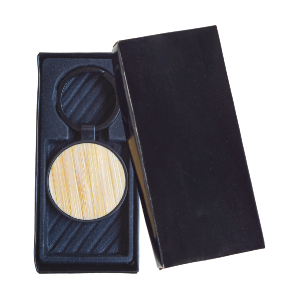 Keychain made of polished black metal, with one side made of soft bamboo