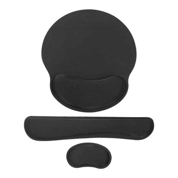 The 3-in-1 Mouse and Keyboard Pad with Wrist Pad includes a keyboard wrist rest, mouse pad with wrist support, and an ergonomic anti-skid gel wrist cushion, designed for comfortable laptop or computer use. The mouse pad measures 25 × 23 × 18.2 cm, the keyboard wrist rest 44.8 × 8.6 × 8 cm, and the additional wrist rest 14.5 × 8 cm. The set can be customized with screen printing.