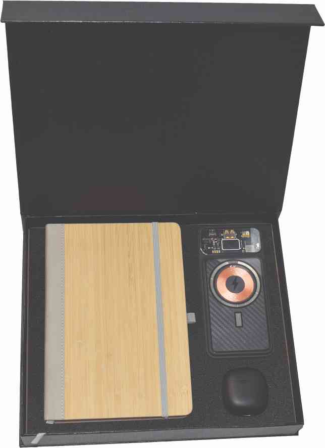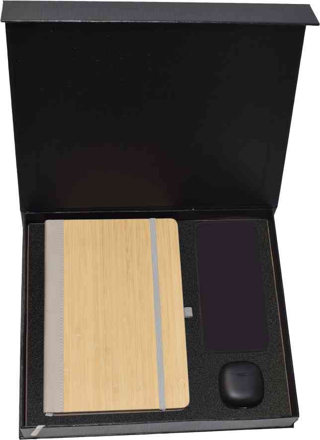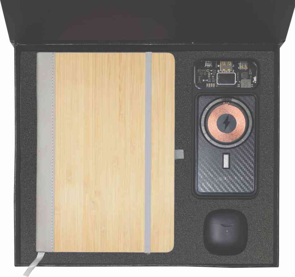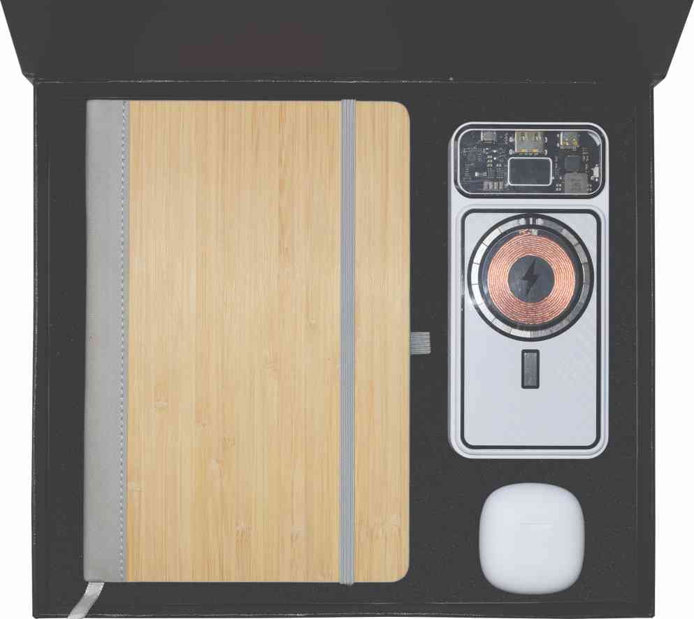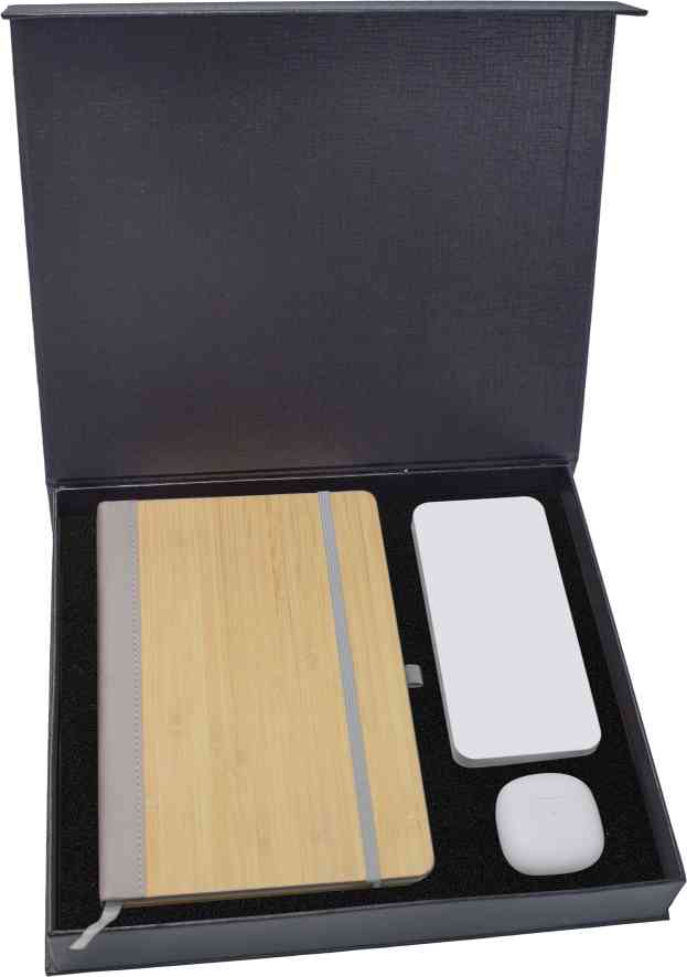 The Promotional Gift Set is a technology and office gift box, containing a magnetic gift box, an AK 124 Power Bank, an ACEO 05 Eco-Friendly Notebook, and HE-055 Wireless Earbuds. The gift box measures 283 × 238 × 50 mm and can be customized with screen printing, UV printing, or engraving.