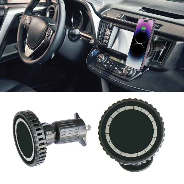 CAR PHONE HOLDER LIGHT UP LOGO Magnetic Phone Holder - Snap Car Mount Air Outlet Bracket - Flexible Strong Magnetic Phone Clip Universal 360 Degree Rotating Car Holder Wireless Phone Holder for Car Input : 9V-2A, Output : 9V -1.67A, Max : 15 W Dimension : 9.55x9.7cm Printing Option : UV Print, Engraving