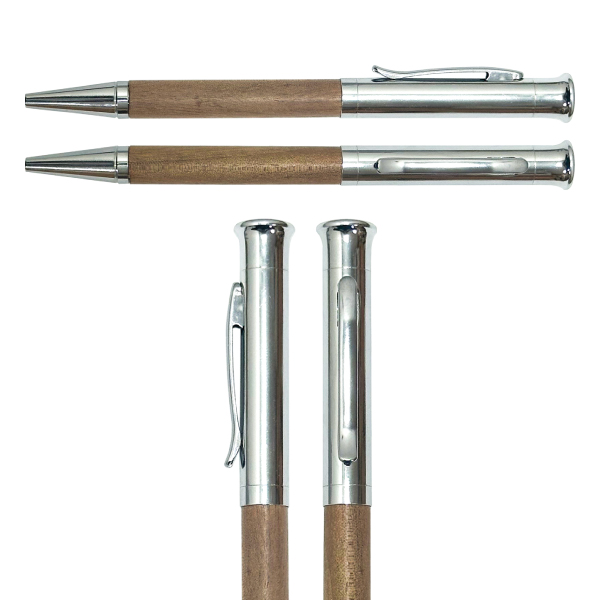 The Personalized Pen is made of metal and wood, measuring 140 × 10 mm. It can be customized with engraving or screen printing.