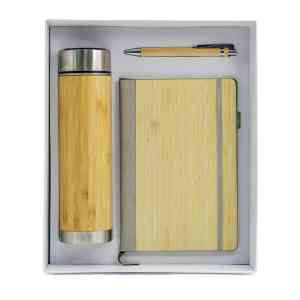 The Promotional Gift Set is an ideal office gift, containing a large top gift box, an ACEO 05 Eco-Friendly Notebook, an AMP 065 Personalized Wooden Pen, and an ATM 21 Bamboo Temperature LED Display Bottle. The gift box measures 300 × 255 × 100 mm and can be customized with screen printing, UV printing, or engraving.