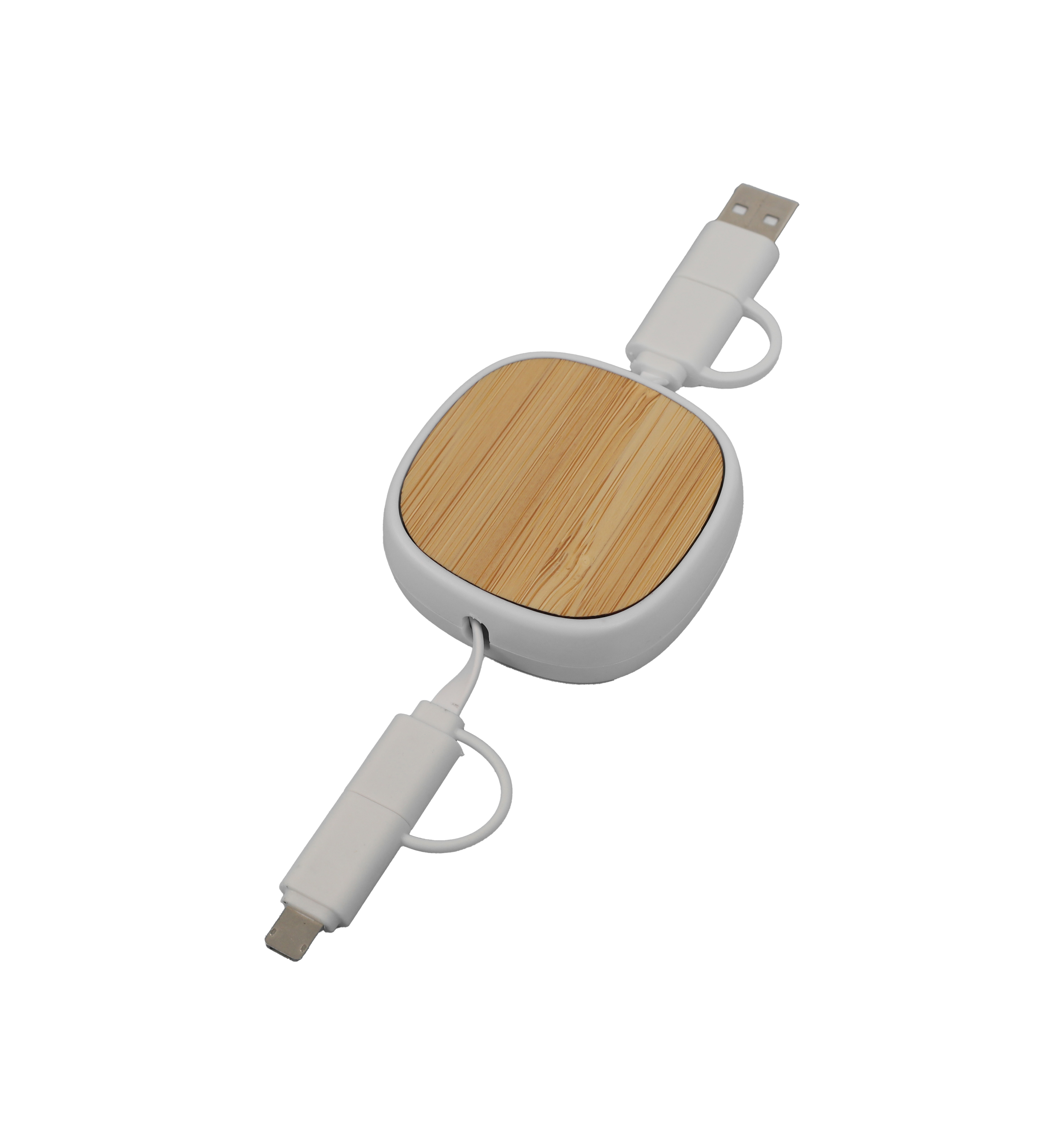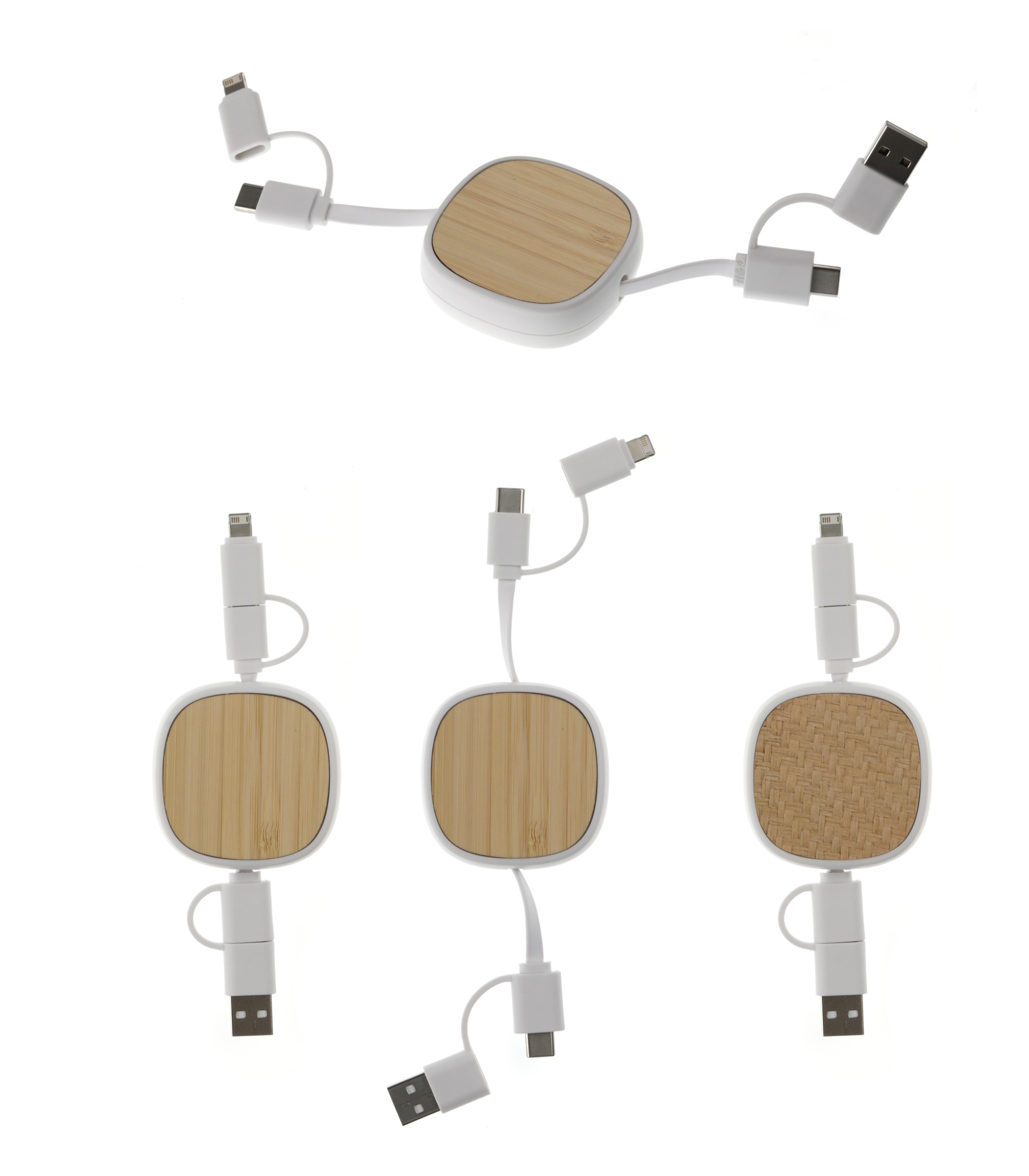 -Material: Bamboo + ABS + Metal -4 in 1 Charging Cable -Fast Charging -USB+Type-C Input Port -Type-C + Micro USB + Lightning & 2-in-1 Port