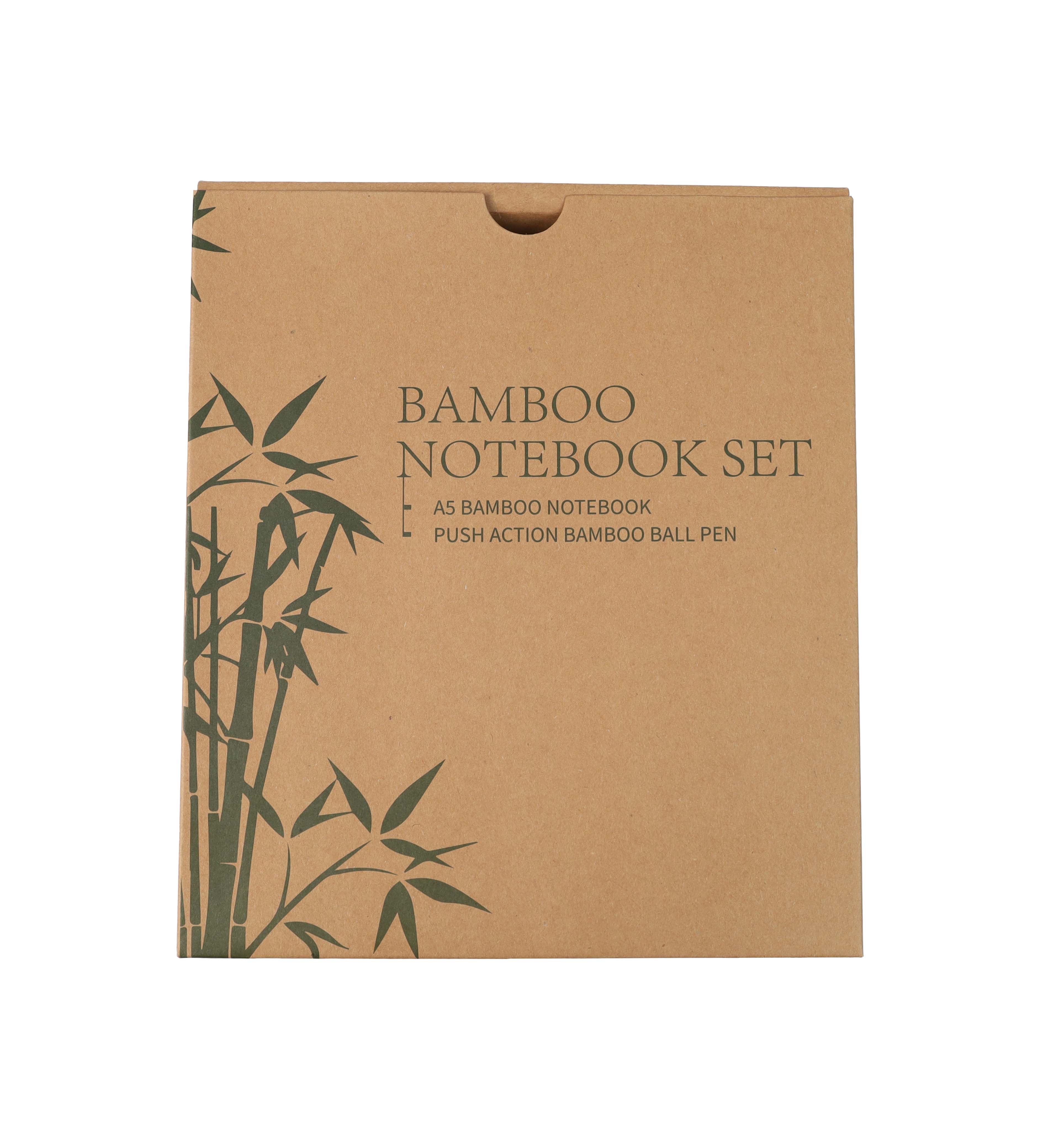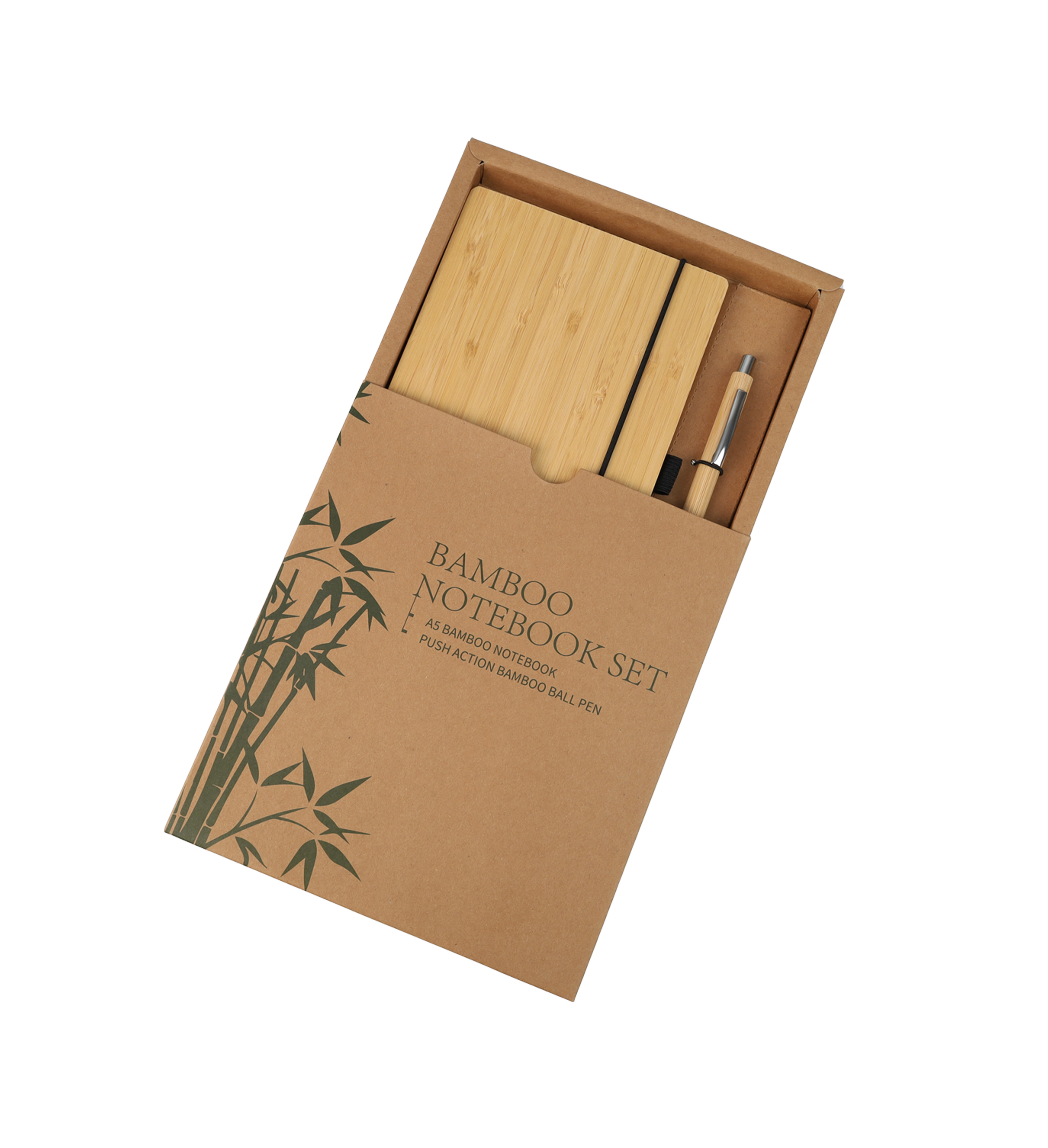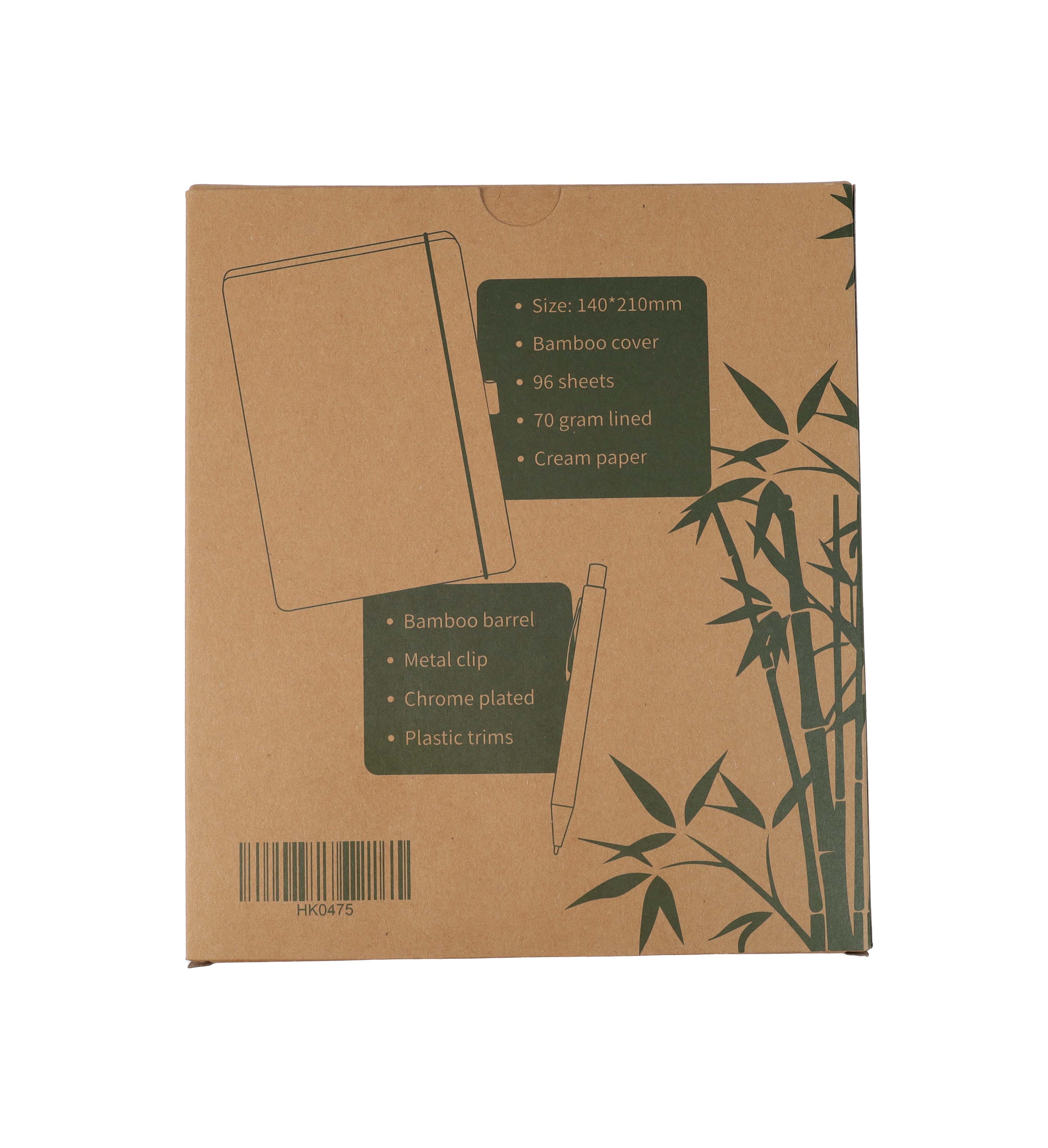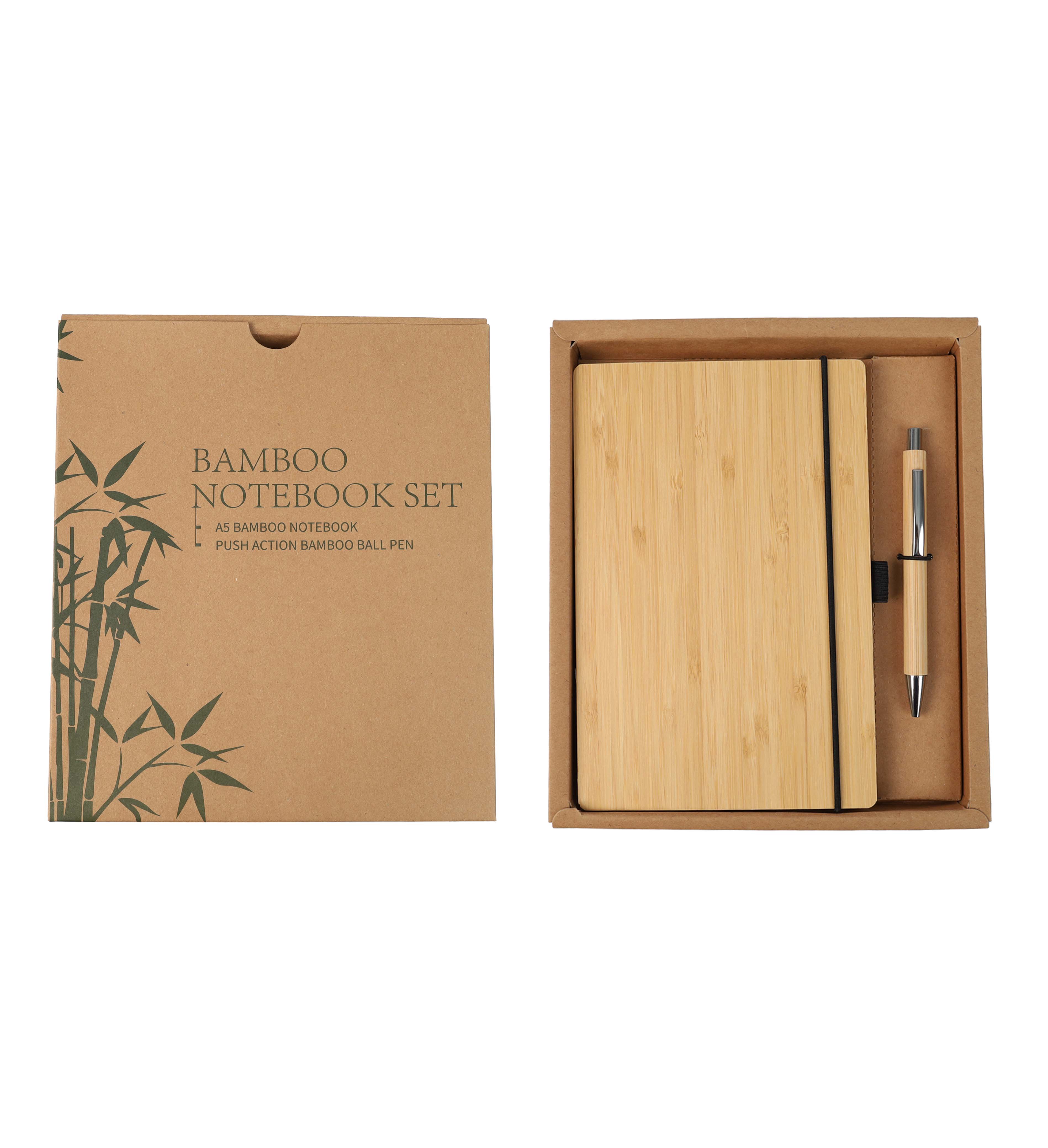 -Eco-friendly Gift Set -A5 Bamboo Notebook with 96 Single-lined Cream Sheets -Notebook with Elastic Closure & Pen Loop -Push Action Pen with Bamboo Barrel -Metal Clip -Chrome Plated Plastic Trims