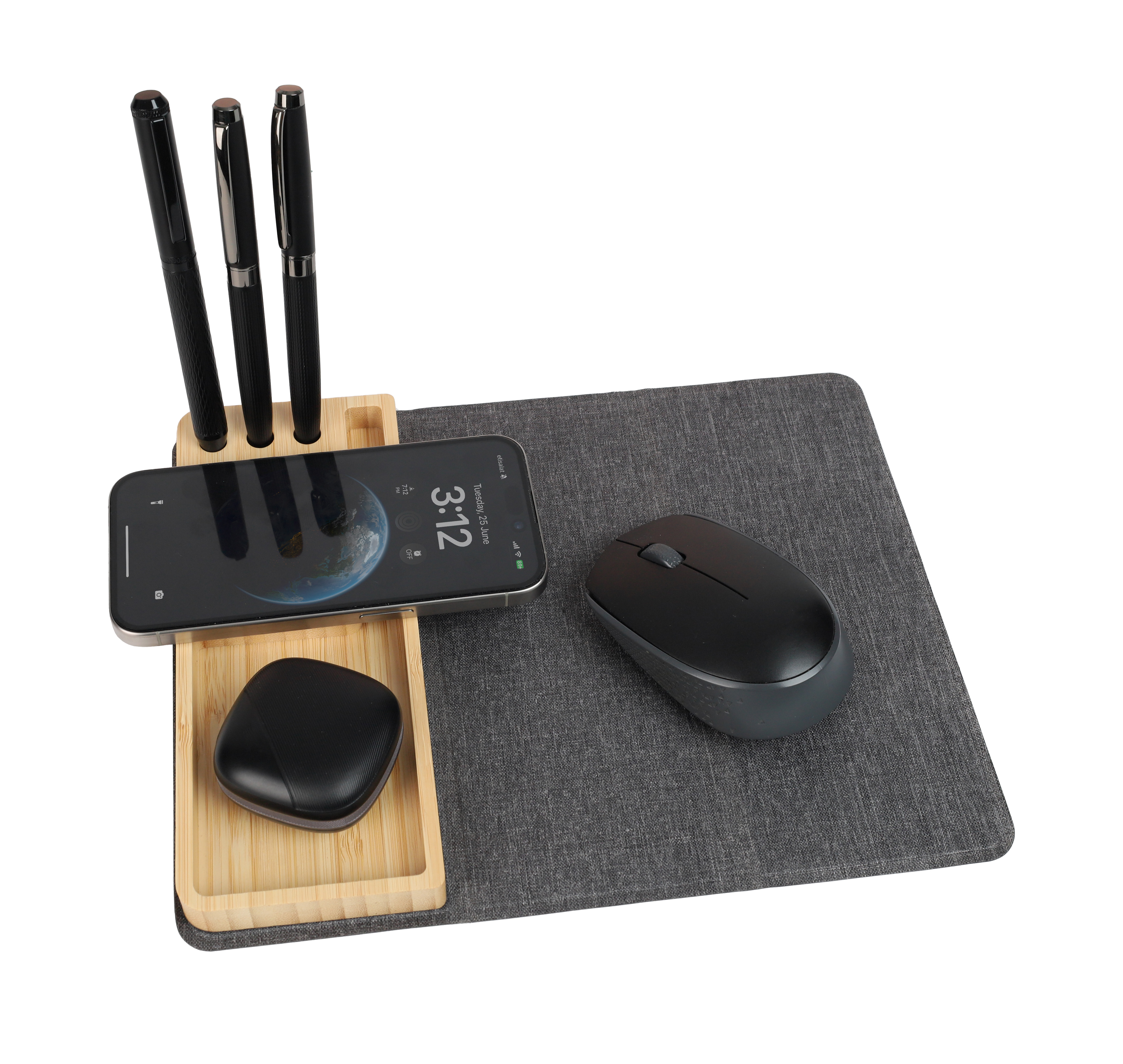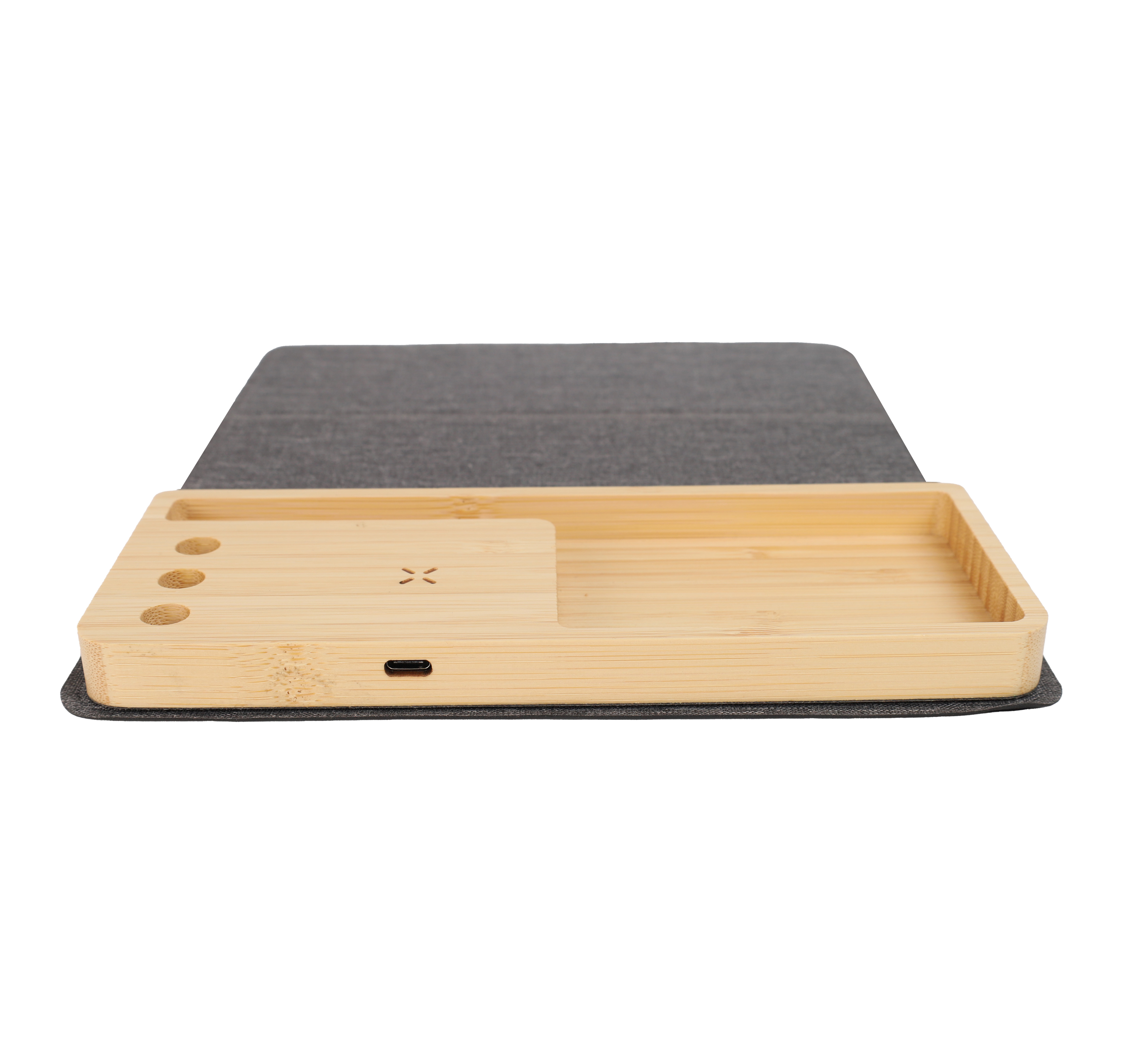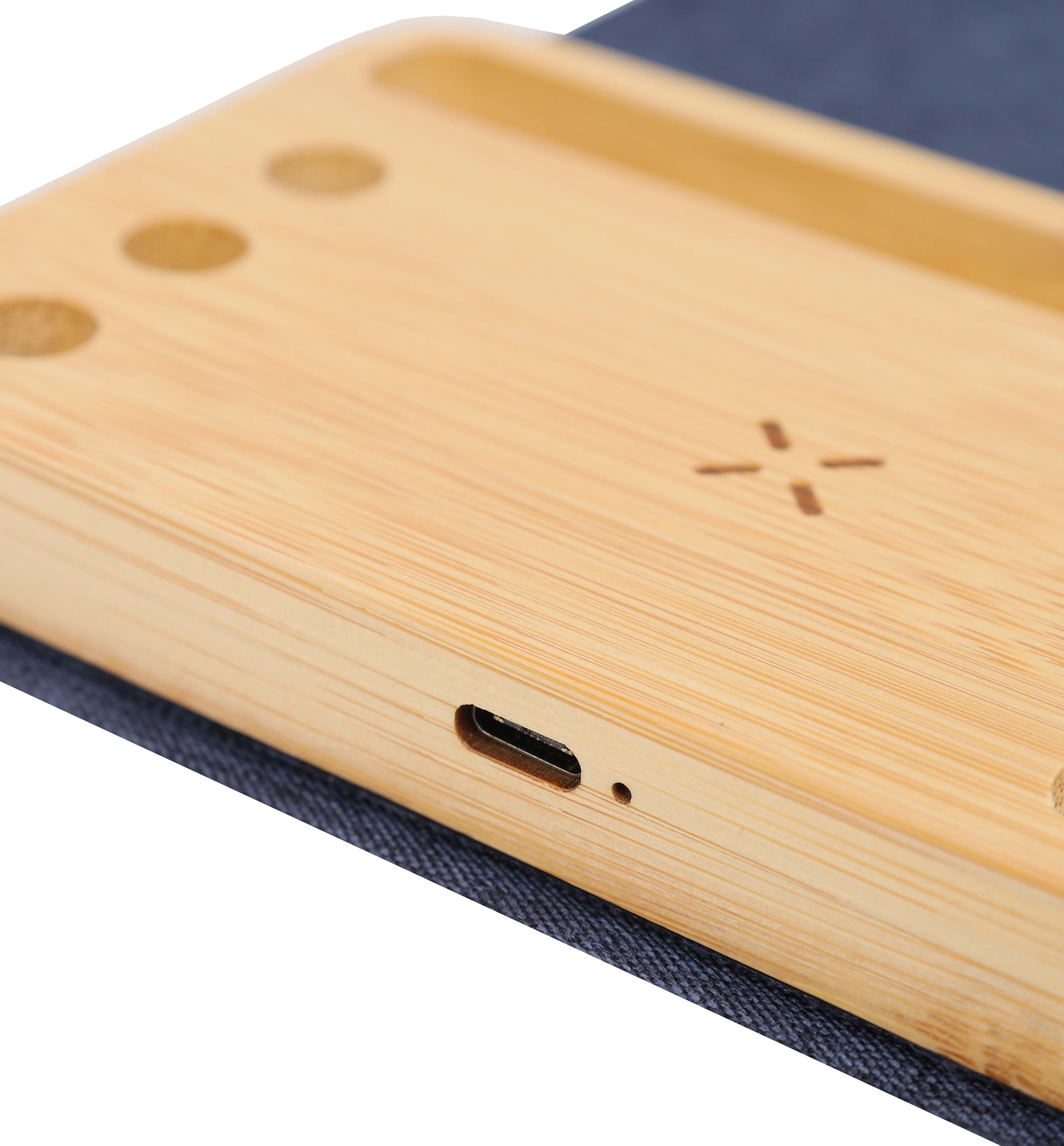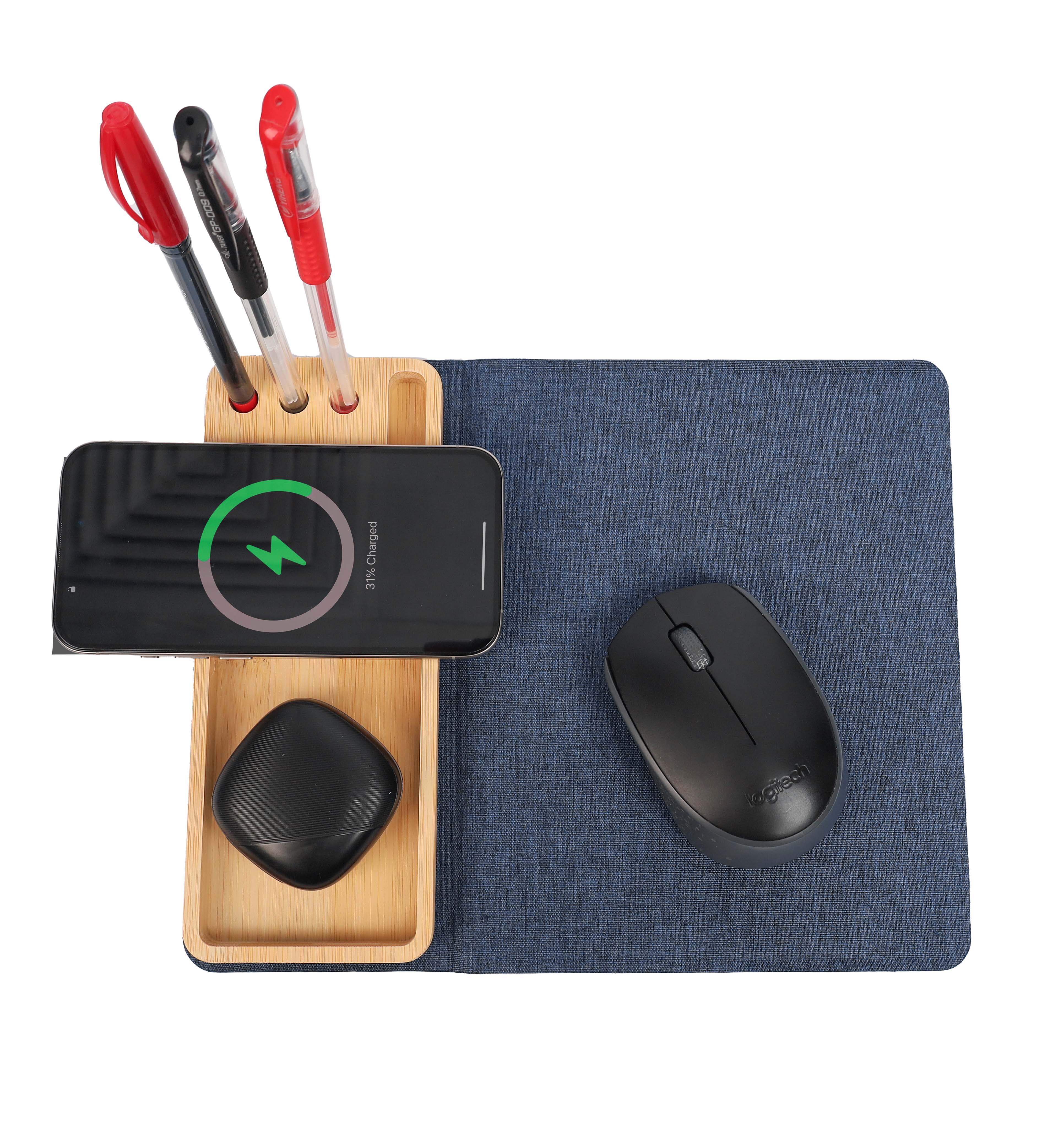 -Material: Recycled PET + Bamboo -15W Wireless Charging -In-built Phone Stand