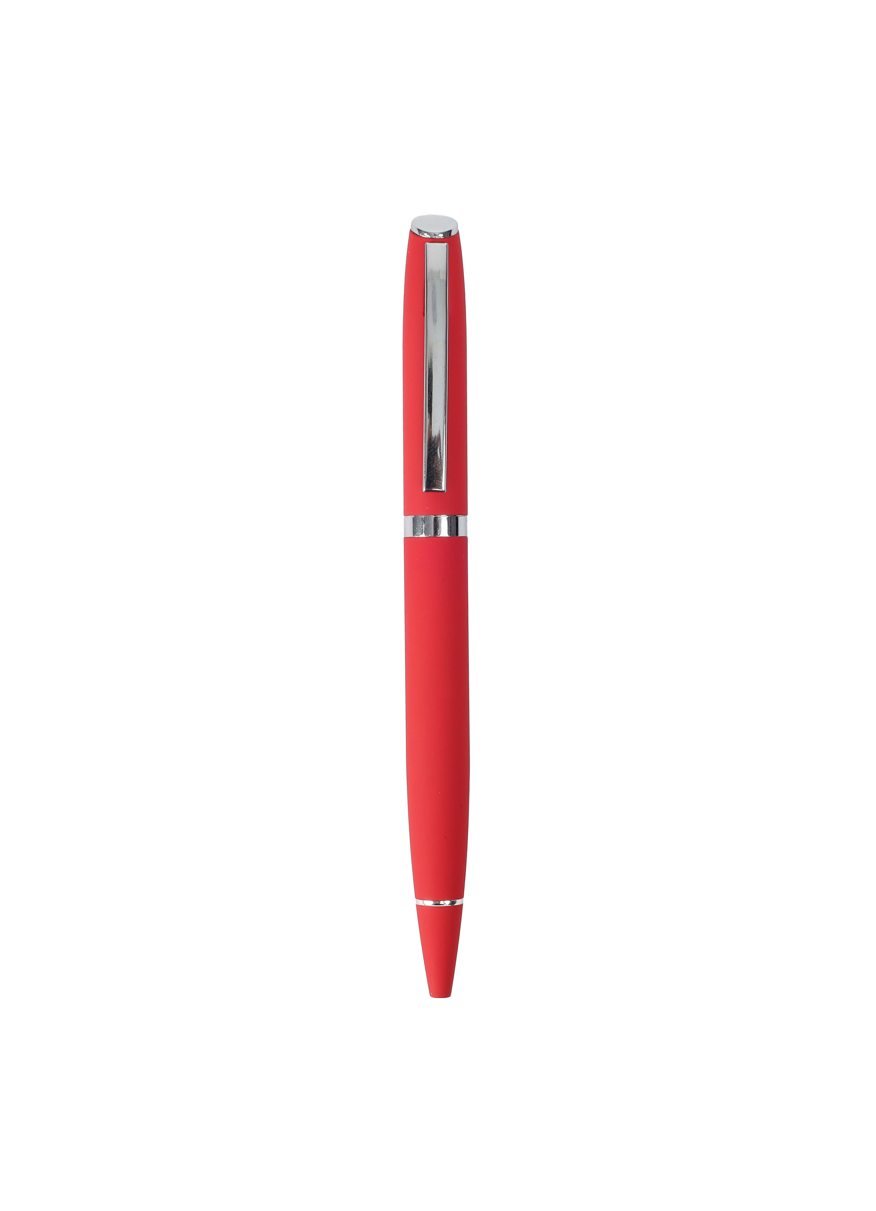 -Material: Rubberized Aluminium Barrel -Metal Clip -Chrome Plated Trims -Twist Action Pen