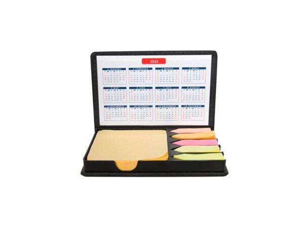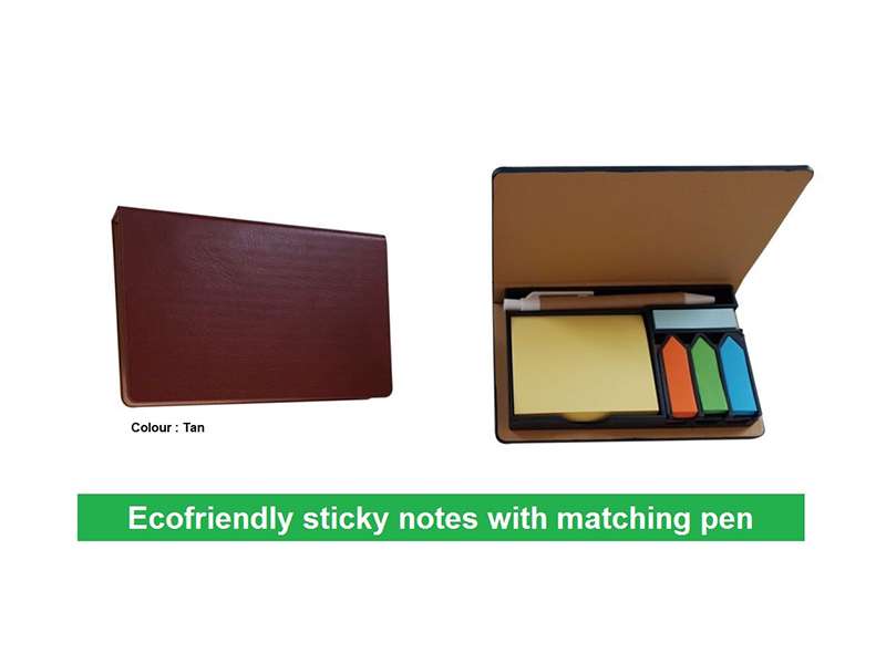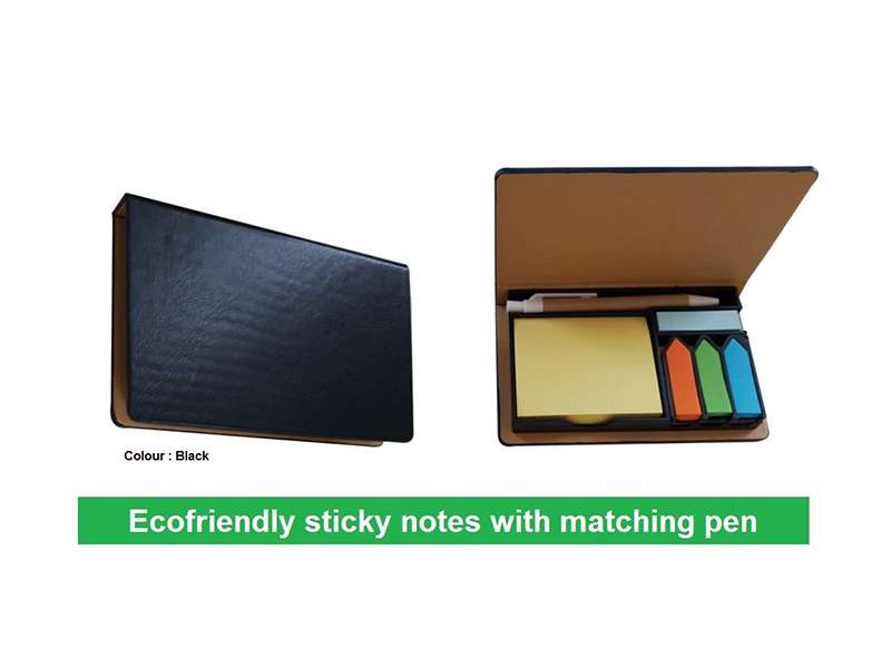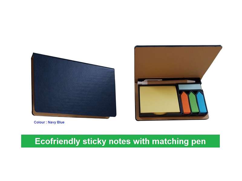 Five different color stickynotes in a set with matching pen blue