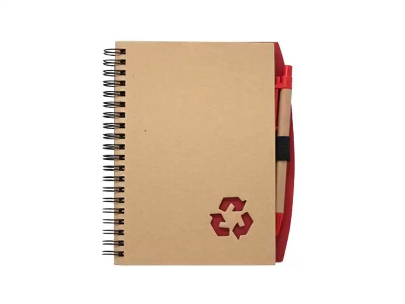 spiral A5 notebook with Red color pen and red color first page with recycle logo