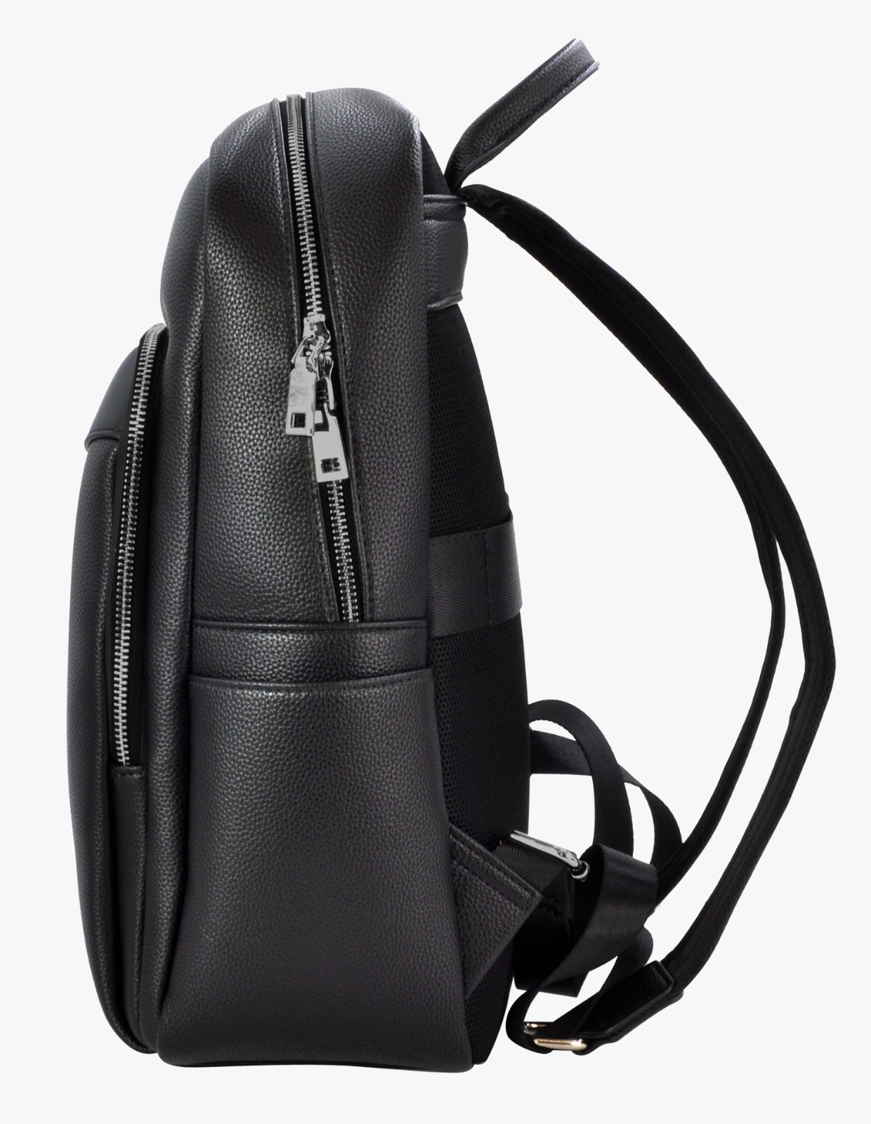 Sleek black backpack with gunmetal zippers