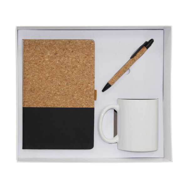 The Promotional Gift Set is an office gift collection presented in a large top gift box, featuring a Cork A5 Notebook ACEO 04, Personalised Cork Pen APP 017, and Ceramic White Coffee Mug ATG-01, with a gift box size of 300 × 255 × 100 mm and printing options including screen print, UV, and engraving.