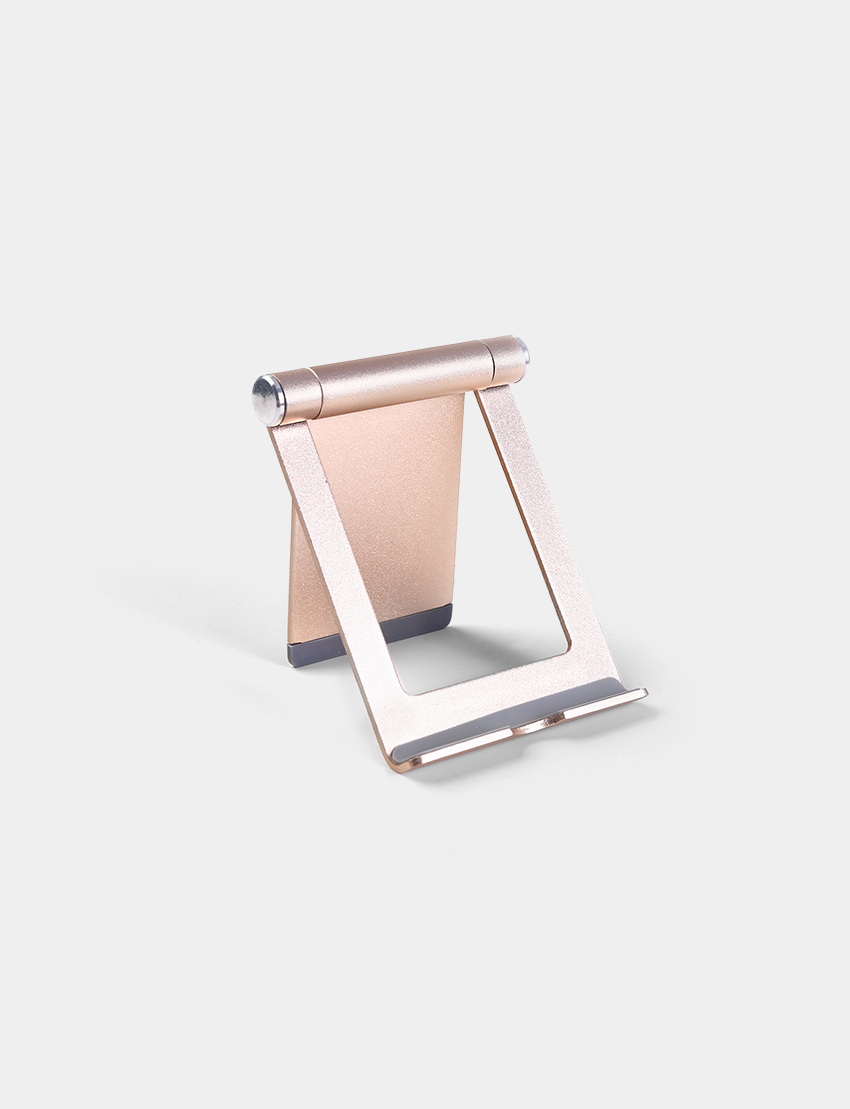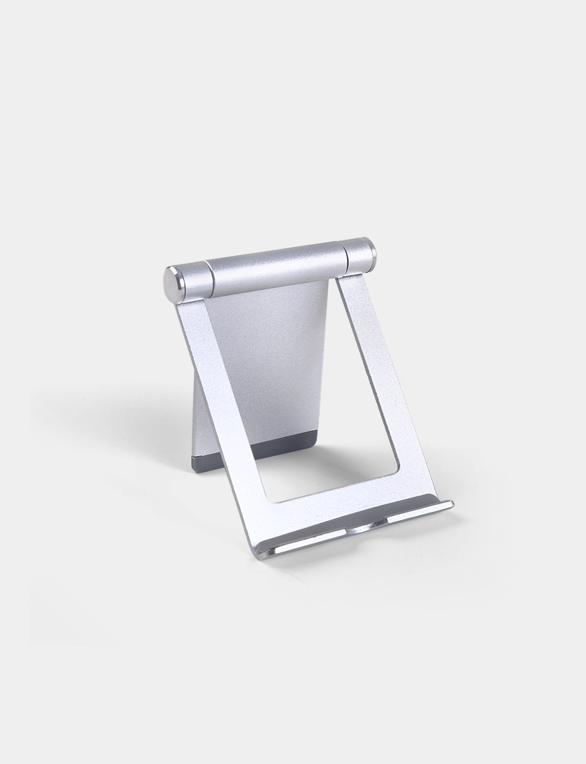 Foldable mobile phone stand in Aluminum material. Product size 9.7cm x 7.3cm Packaging paper box