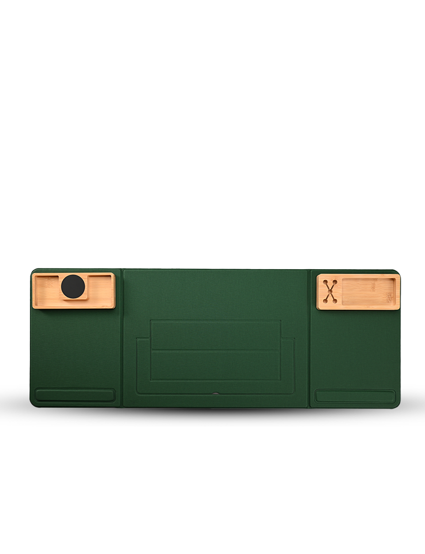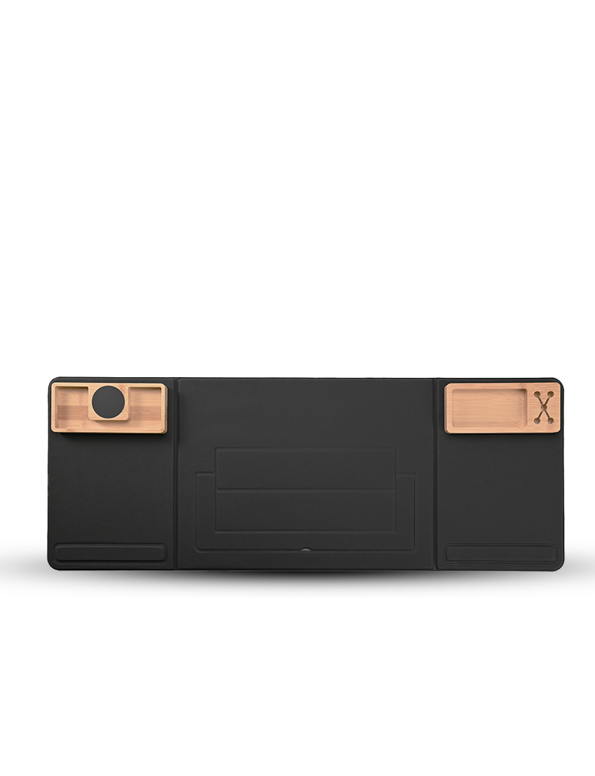 Foldable Desk Pad Organizer with laptop stand and two magnet bamboo organizers. One is pen & business card holder and the other one Has 15W wireless charger and light up piece. Material has no stitching welding technology RCS PU Material. Has a part that can be used as mousepad with armrest which is very perfect for daily desktop activity. Product Size 80x29.8x1.8cm (open) and 40x29.8x1.8cm (folded) Packaging FSC Paper Box