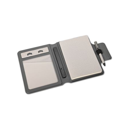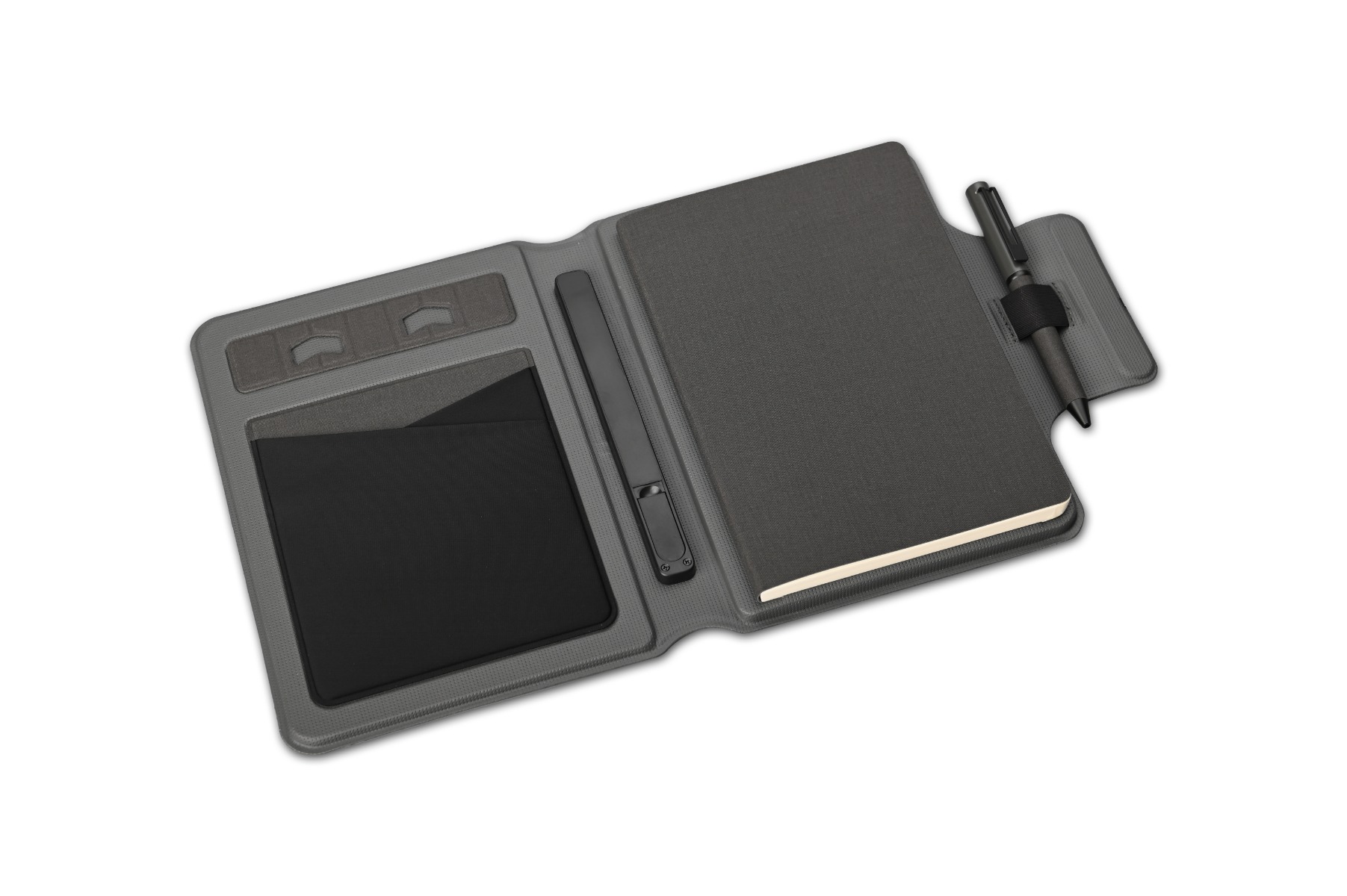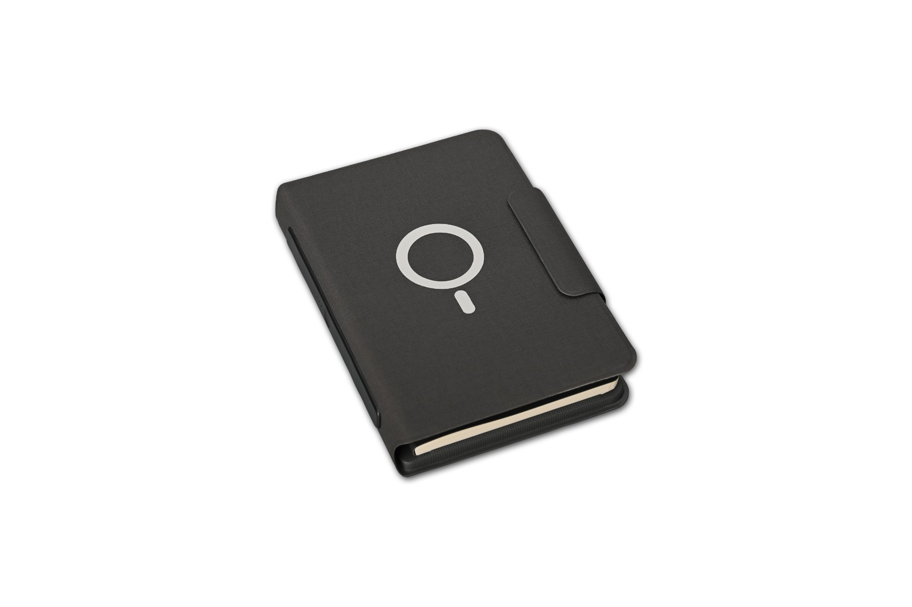 10W MagSafe A5 Fast Charging 64 sheets notebook organizer with builtin wireless 8000MAH powerbank and 32GB USB. Made from special PU Material with nonstitching welding technology. It has Lycra pocket organizer on the inside foldable phone stand and pen holder. Its power system on its spine and magnetic flap closure makes it easy to use. With LED power indicator and TYPE C input and output for fast charging. Product Size 23.2x18x2.5cm. Packaging Black Drawer Box
