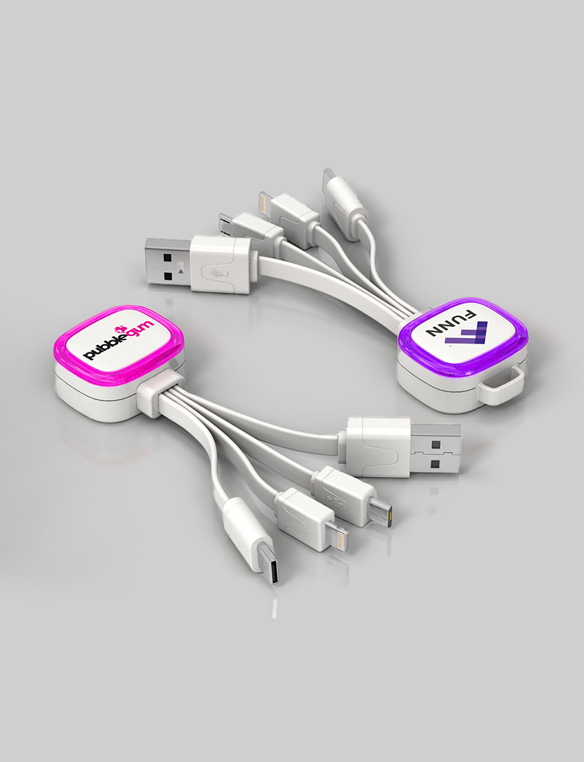 Multi Charging Cable with micro pin*1 TypeC*1 Lightning*1(Apple USB) USB port *1. Fast Charging cable with data transfer function. Charge 3 devices at same time. LED trim illuminate logo printing logo. Product Size 11.5x3.1x2.6cm Packaging White Paper Box
