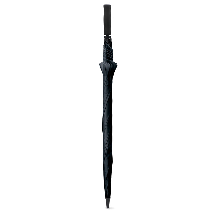 30 inch manual open windproof umbrella in 190T polyester with fiberglass shaft and ribs. Black plastic tips and top. Straight black EVA handle. Manual closure.